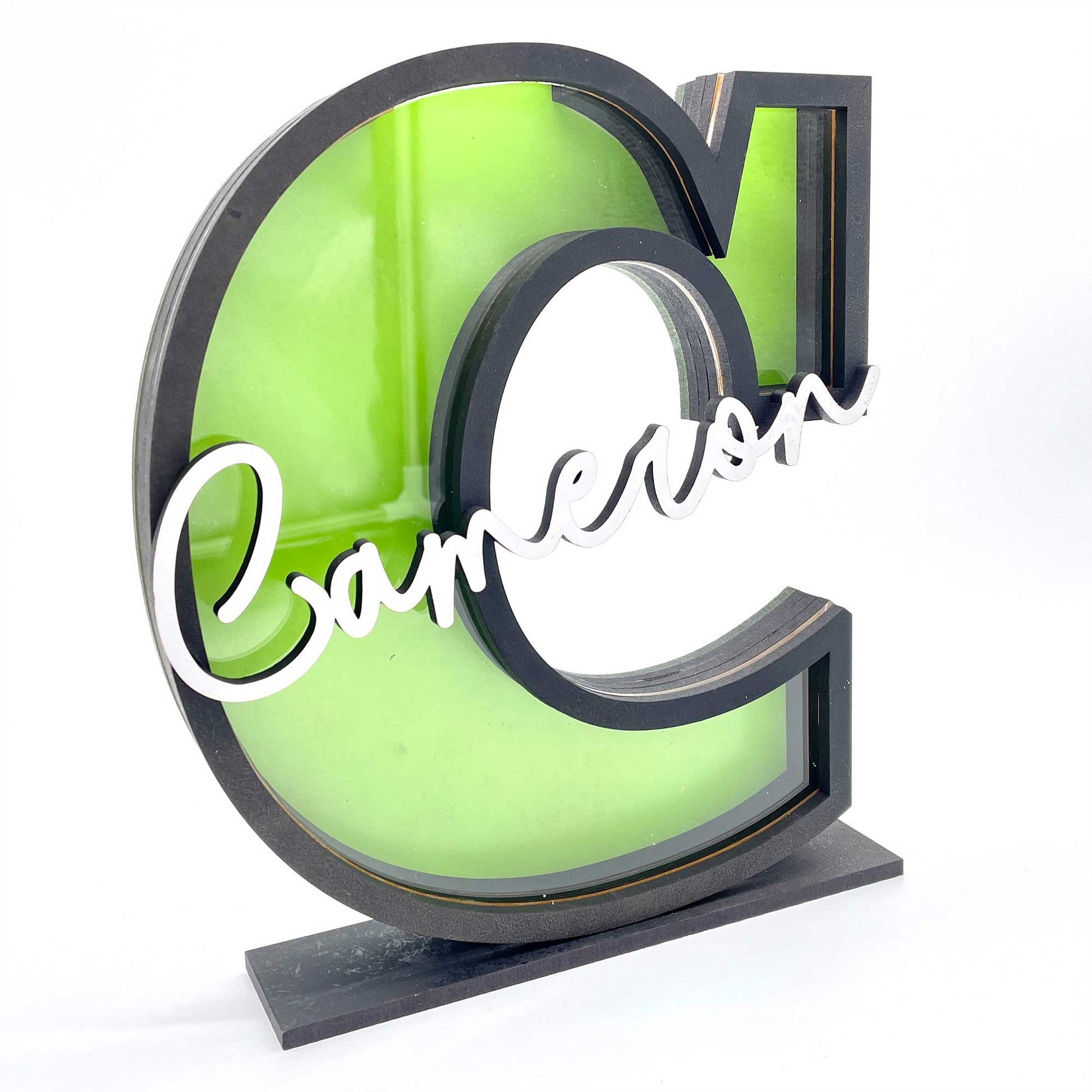Measures about 9x8" and just depends on the letter wanting. PLEASE let us know what letter you are wanting and the background color you would like to order. I do have most primary colors and others available. We use wood, clear acrylic and white acrylic to make your product. These are made to order and not in stock as we do personalize them.