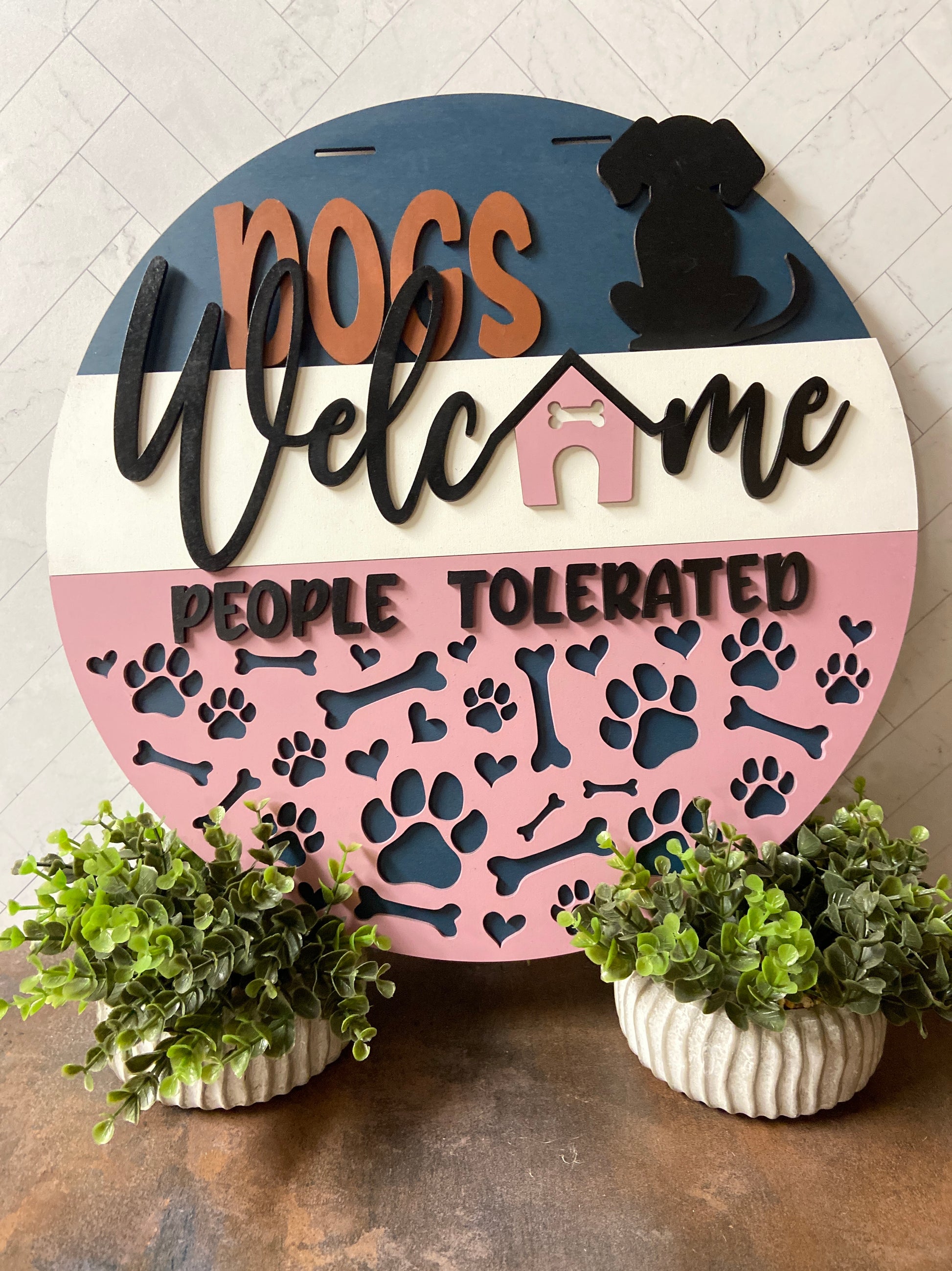 This 16-inch laser cut and hand painted door hanger is the perfect addition for any dog lover's home. Its unique design adds a touch of whimsy while also showcasing your love for your furry friends. Easy to hang, this door hanger is a charming way to welcome guests. Colors will vary