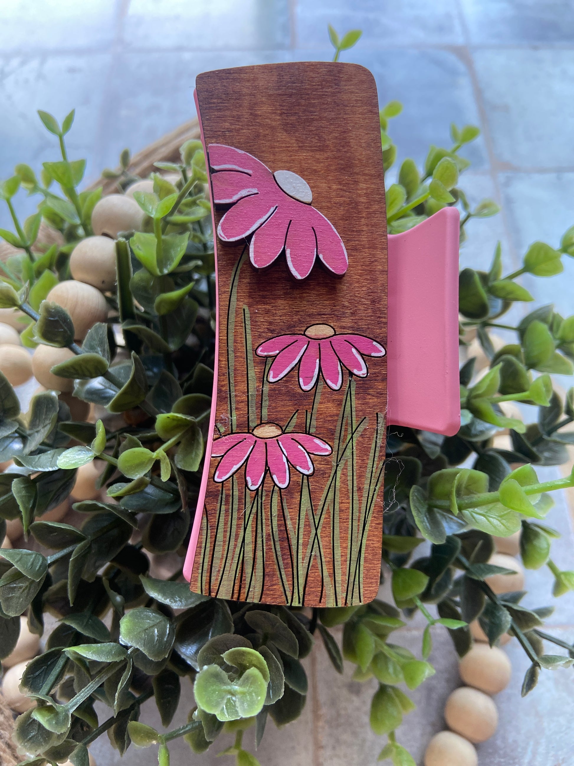 Effortlessly elevate any hairstyle with our 3 Flower Hair Clip. Each clip is intricately laser cut and engraved, then hand painted with vibrant colors for a unique touch. At 4 inches in size, this clip is perfect for adding a pop of color and style to your look. Please note that colors may vary due to customization options.
