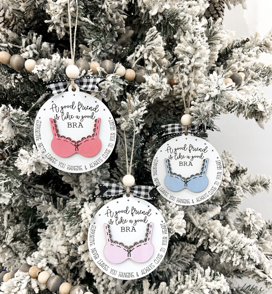 This handcrafted A Good Friend - Bra Ornament is expertly laser cut and engraved, then carefully painted and glued for a truly unique touch. Measuring at 3.5 X 3.5 inches, each ornament varies in color, adding to its charm. Celebrate the special bond of friendship with this beautiful ornament.