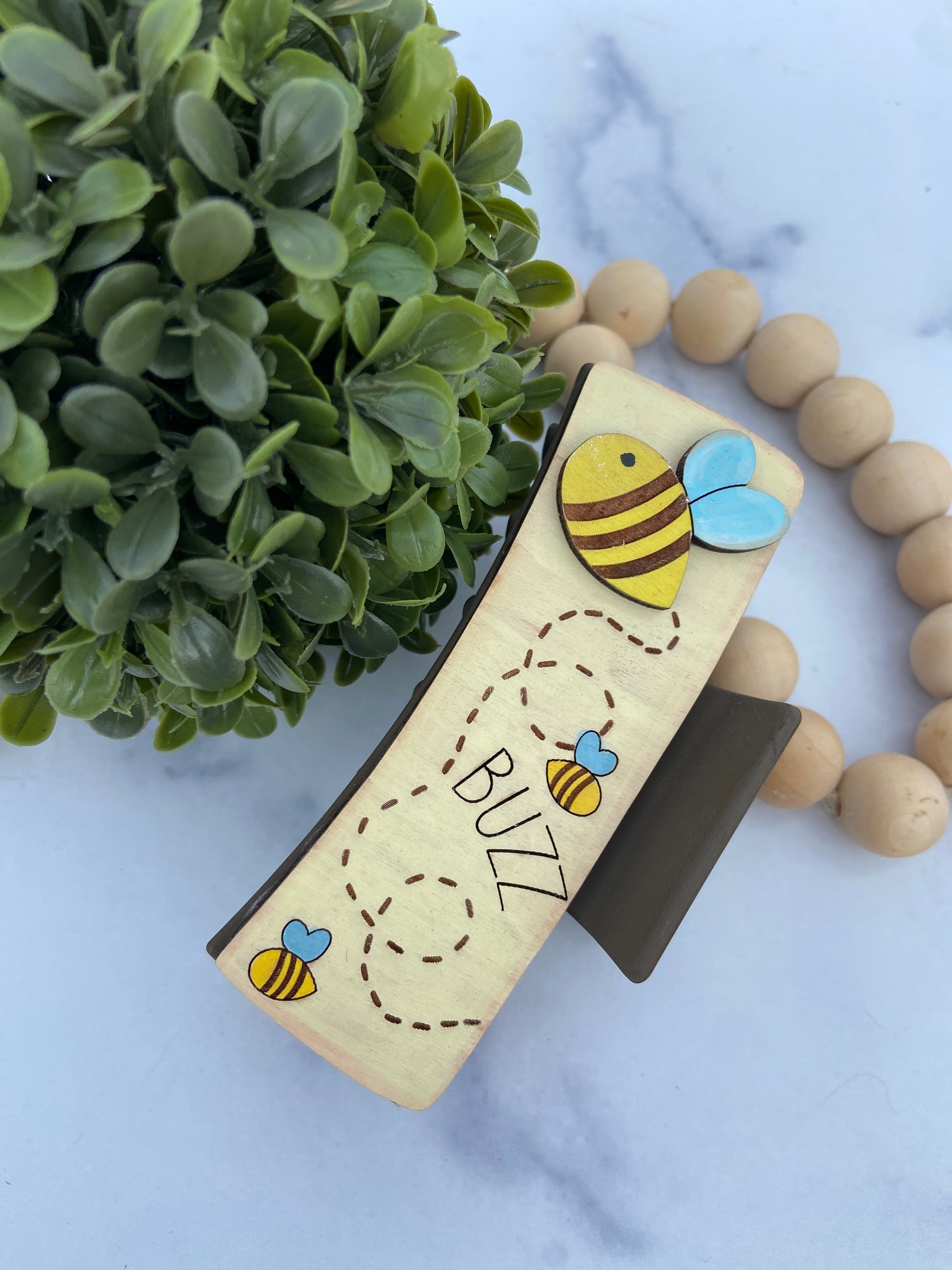 Transform your hair into a buzzing bee with Bee Buzz! This laser-cut and hand-painted hair clip features a cute design that won't sting. With a 4-inch size and varying colors, you can enjoy a "bee in your bonnet" without any worries.