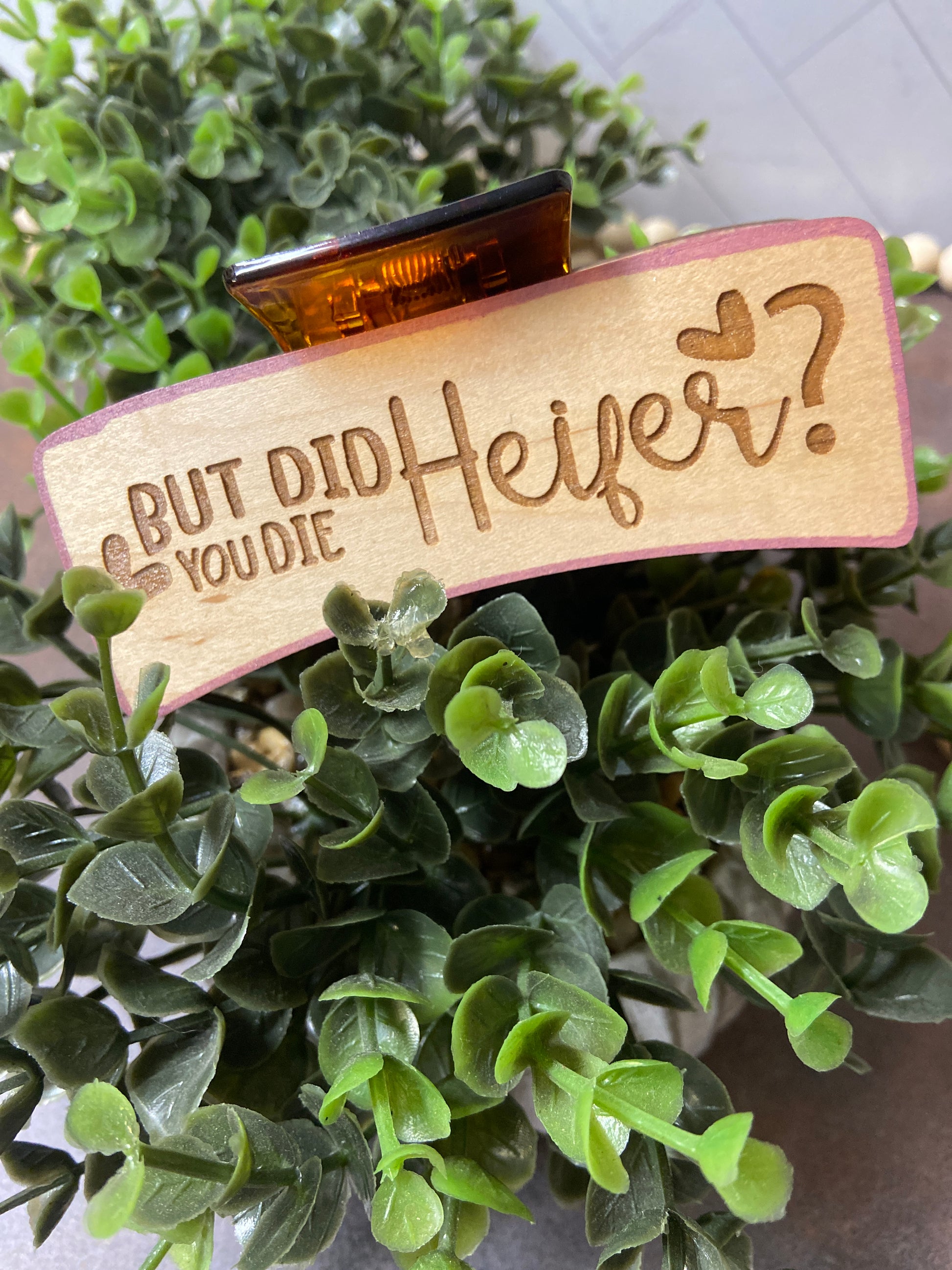 The But Did you Die Heifer Hair Clip is crafted using laser cutting and engraving techniques, resulting in a 4 inch design. Each clip is unique with slight staining or hand painting, making it a one-of-a-kind accessory. Add a touch of personality to your hairstyle with this versatile clip.
