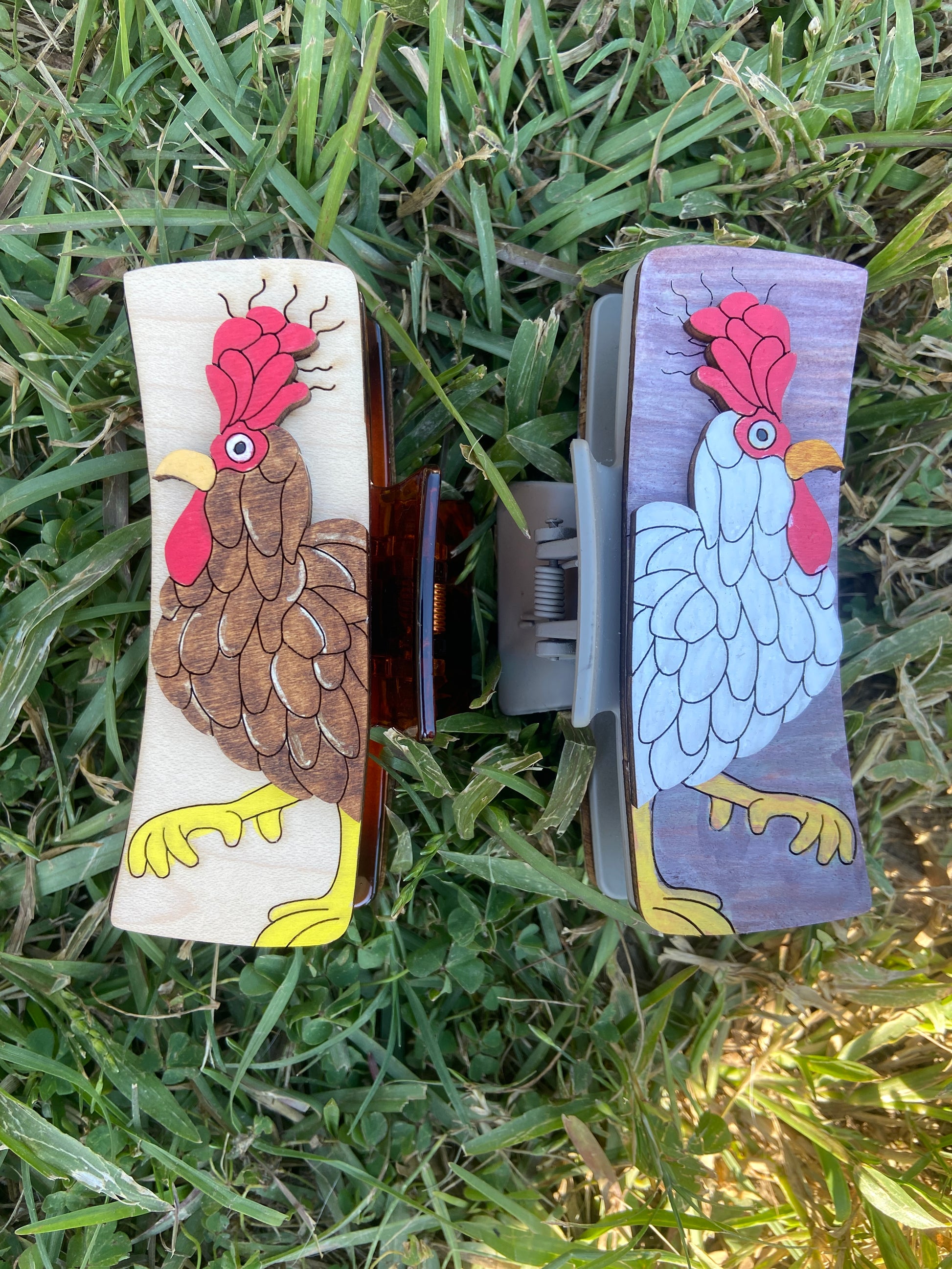 Introducing our exquisite Chicken 2 Hair Clip. Made with precision laser cutting, this beautifully designed clip is also hand painted for added detail. At 4 inches, it's the perfect size for any hair type. Elevate your style with this unique accessory.
