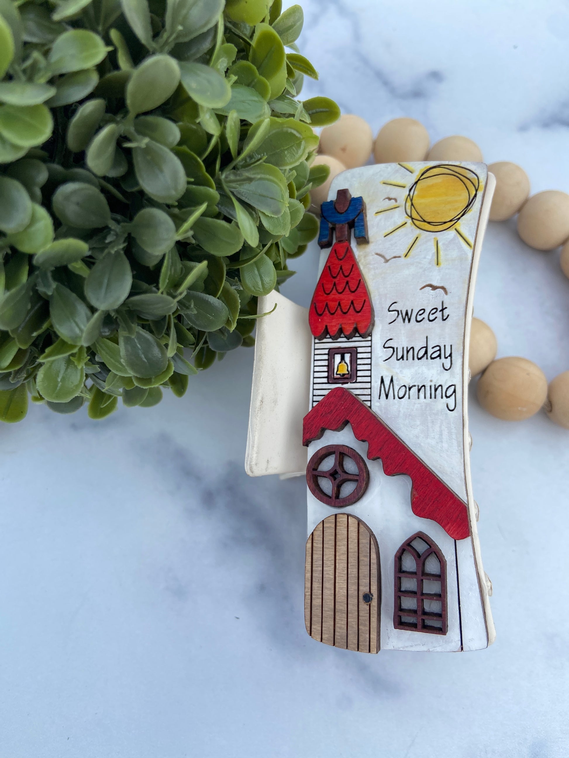 This 4 inch hair clip features a beautifully detailed church design, achieved through laser cutting and hand painting or staining. Perfect for adding a touch of elegance to any hairstyle, while showcasing your faith.