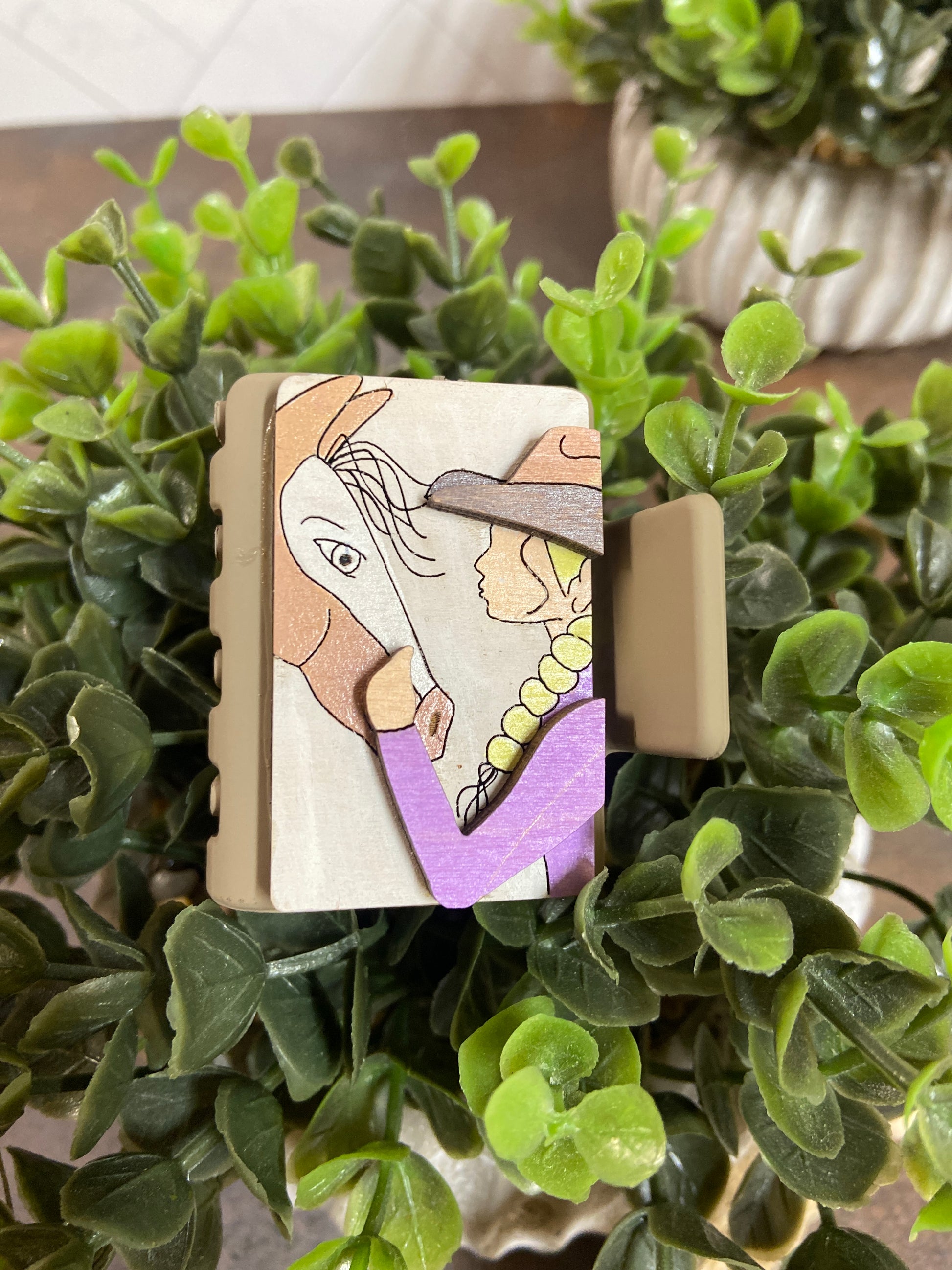 Celebrate your love for horses with this hand-crafted Cowgirl and Horse Hair Clip. Featuring a laser-cut and engraved design, this 2 inch clip is perfect for any cowgirl's hairstyle. Show off your love for horses in a unique and stylish way.