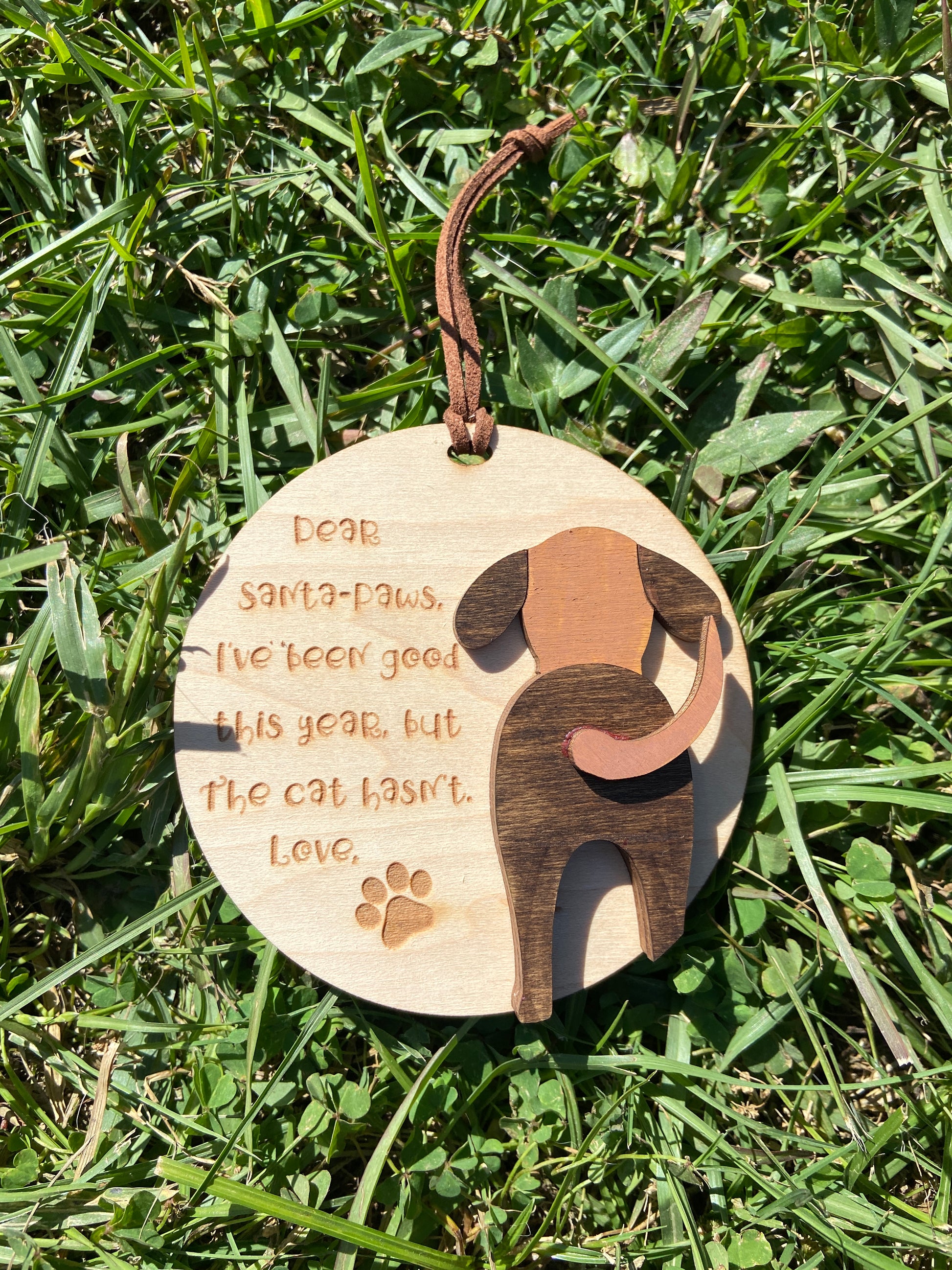 Add a festive touch to your Christmas tree with the Dog Santa Paws Ornament. Measuring 3.5 X 3.5 inches, this adorable ornament is laser cut, hand painted or stained, and ready to hang. Show off your love for dogs this holiday season.