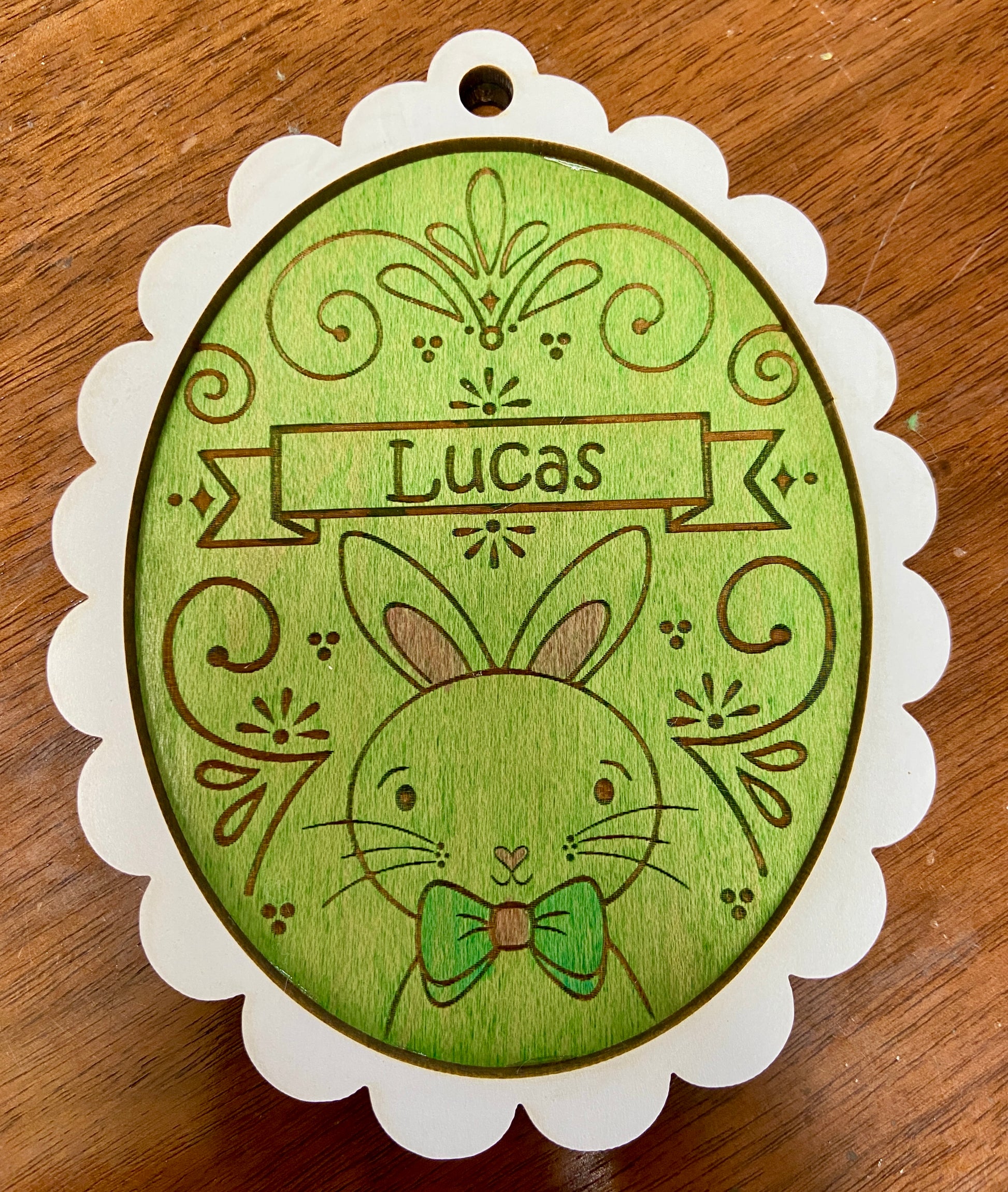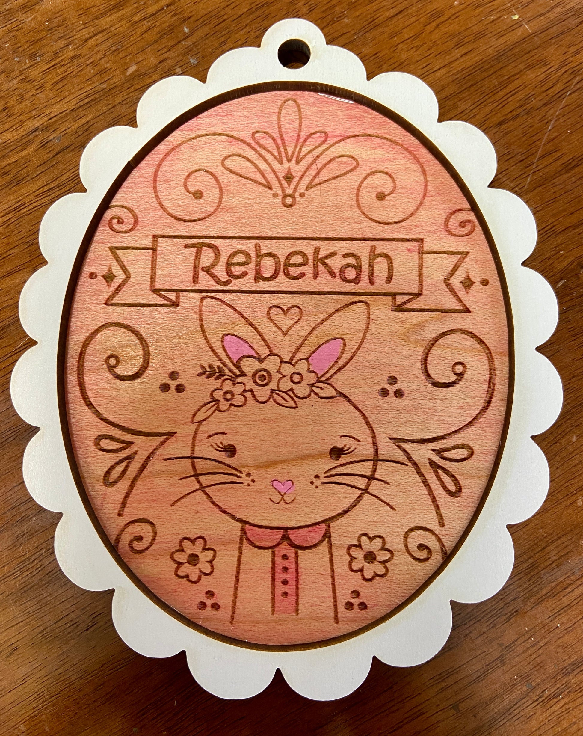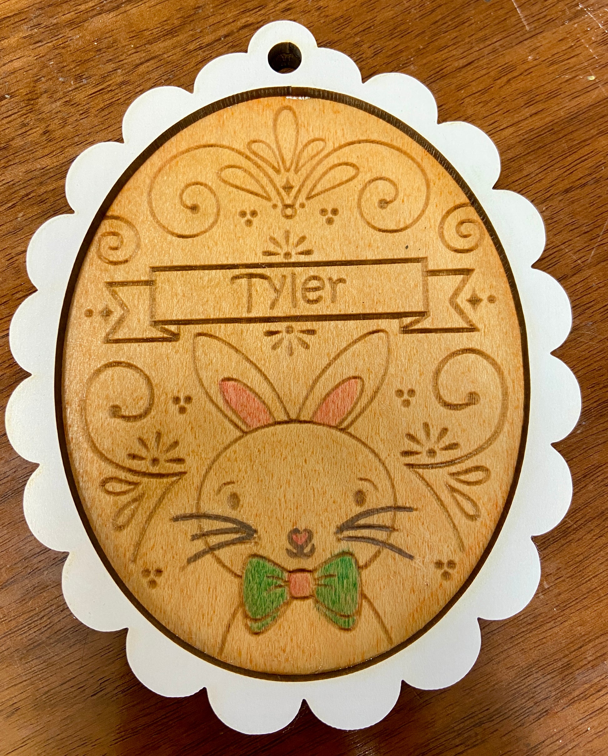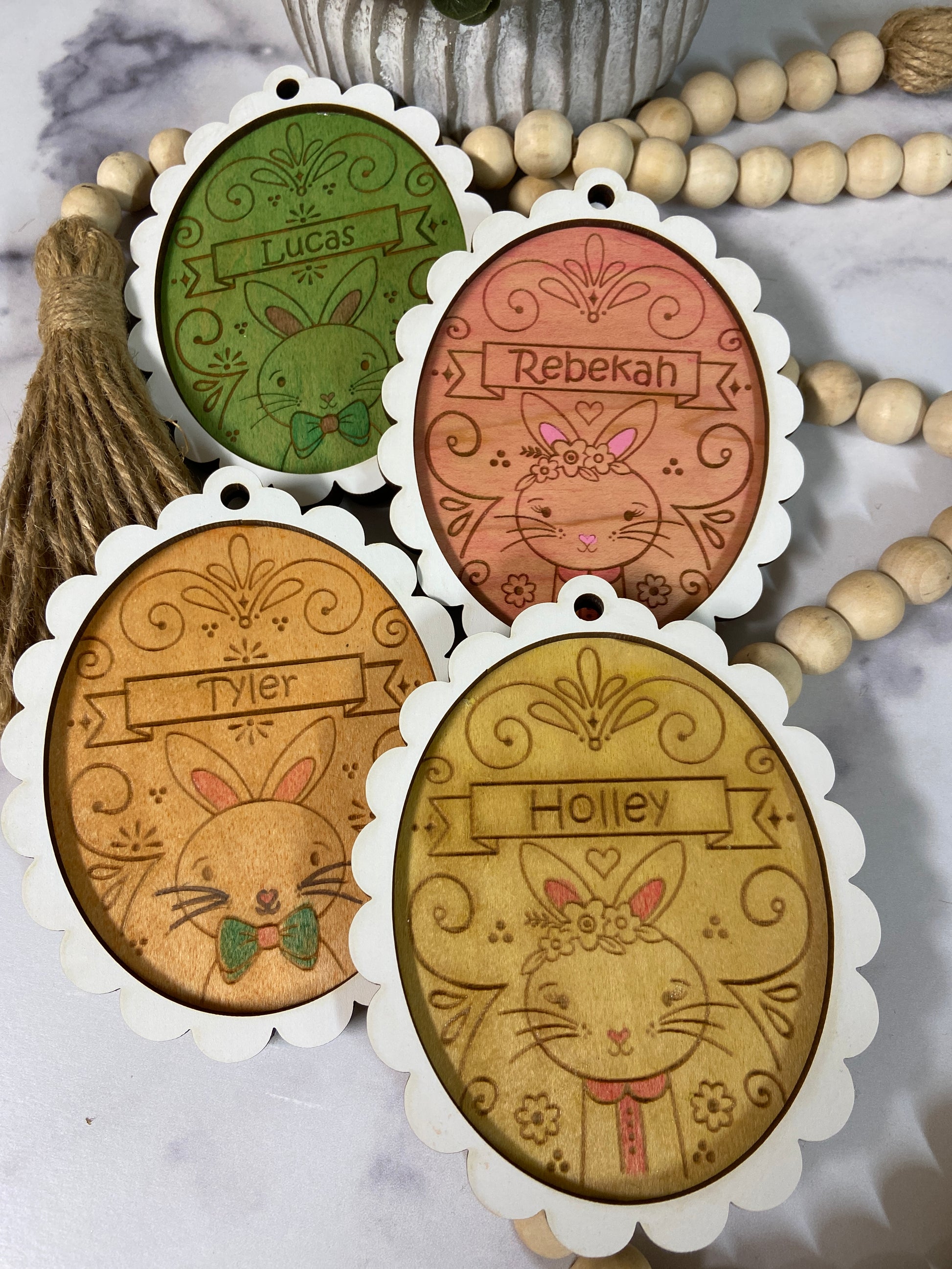 Enhance your child's Easter egg hunt with these charming Easter Basket tags. Featuring laser cut and engraved designs, these tags can be personalized with your child's name. Optional hand staining adds a unique touch. Measures 4.5 X 3.5.