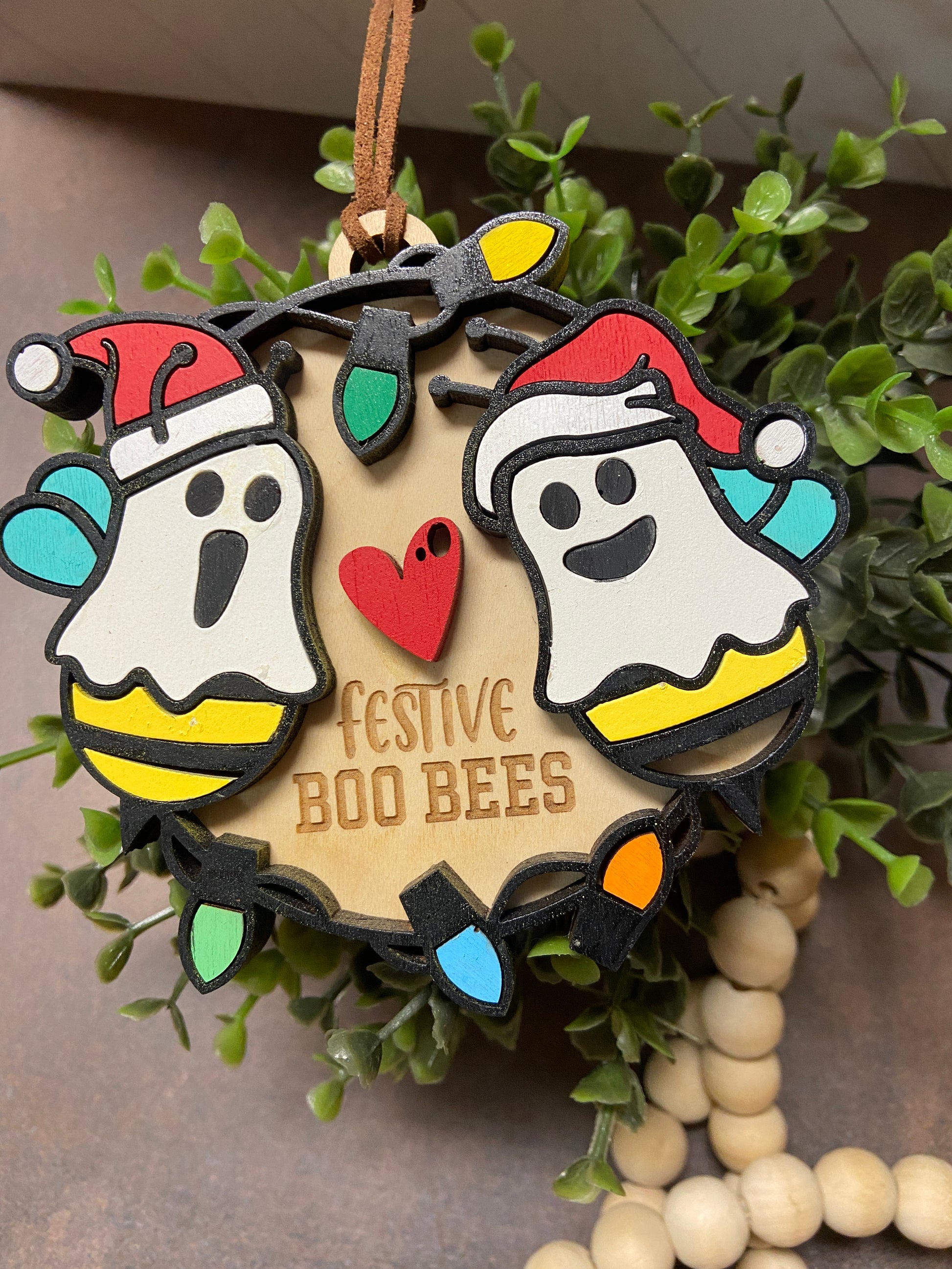 This festive boo bees ornament is expertly designed with laser cut engravings, hand painted details, and secure glue for a stunning addition to your holiday decor. Measuring at approximately 3.5 x 3.5 inches, this 2-layered ornament is sure to be a unique and eye-catching centerpiece.