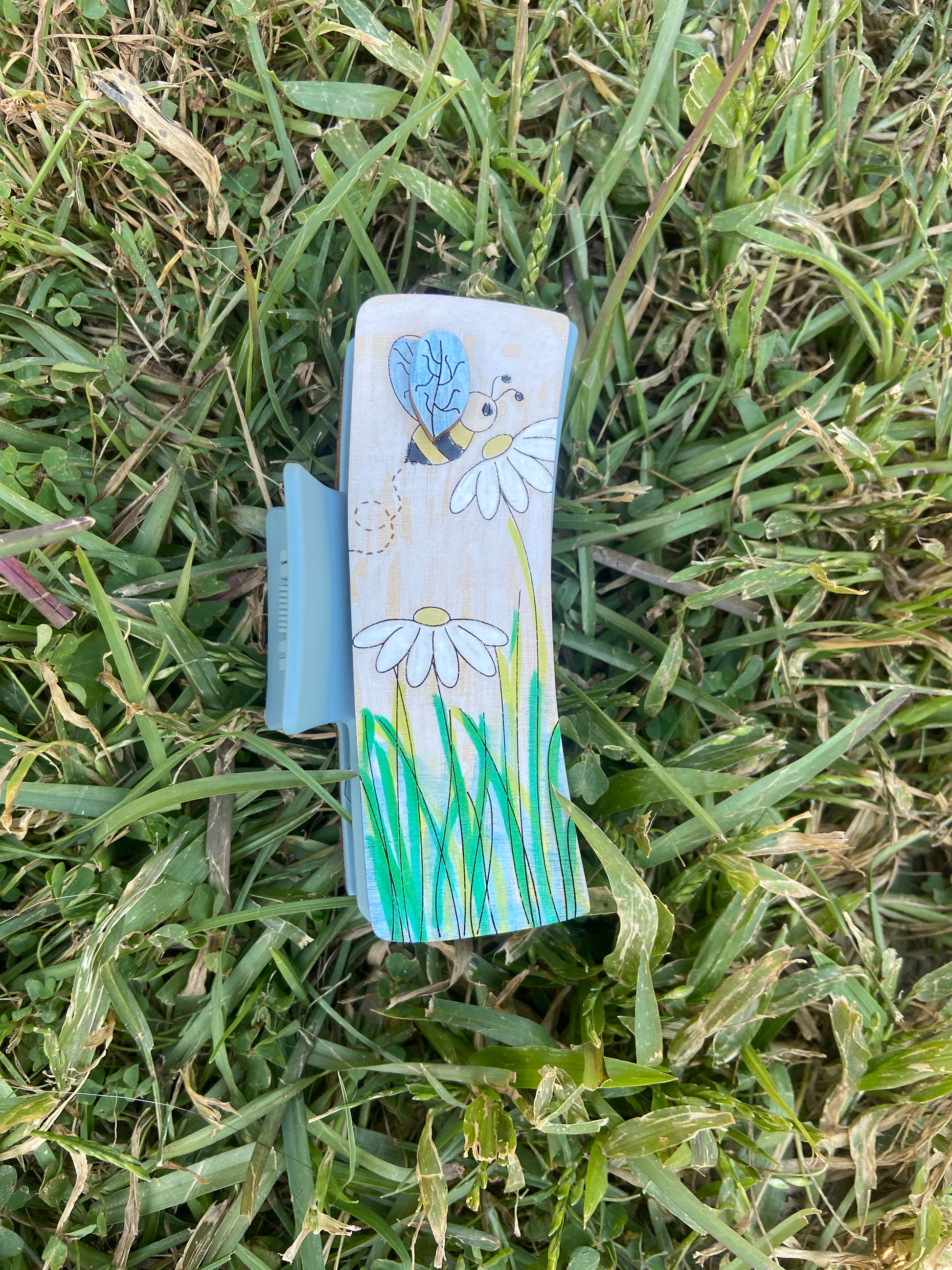 This 4 inch Flower with Bee Hair Clip is perfect for adding a touch of nature to your hairstyle. The intricately hand painted bee adds a charming detail to the laser cut flower design. Made with high quality materials, this clip is both durable and stylish. Colors will vary.