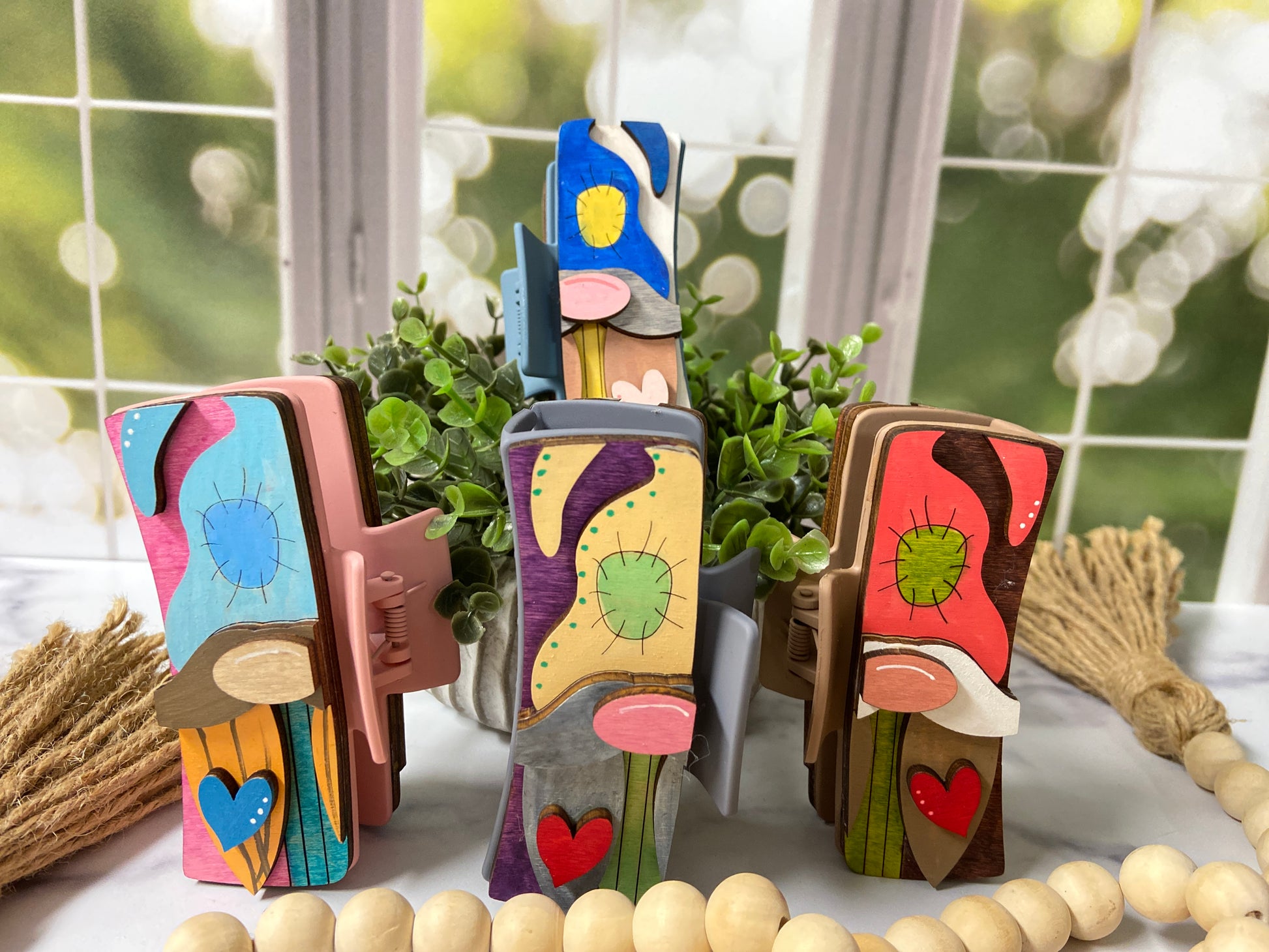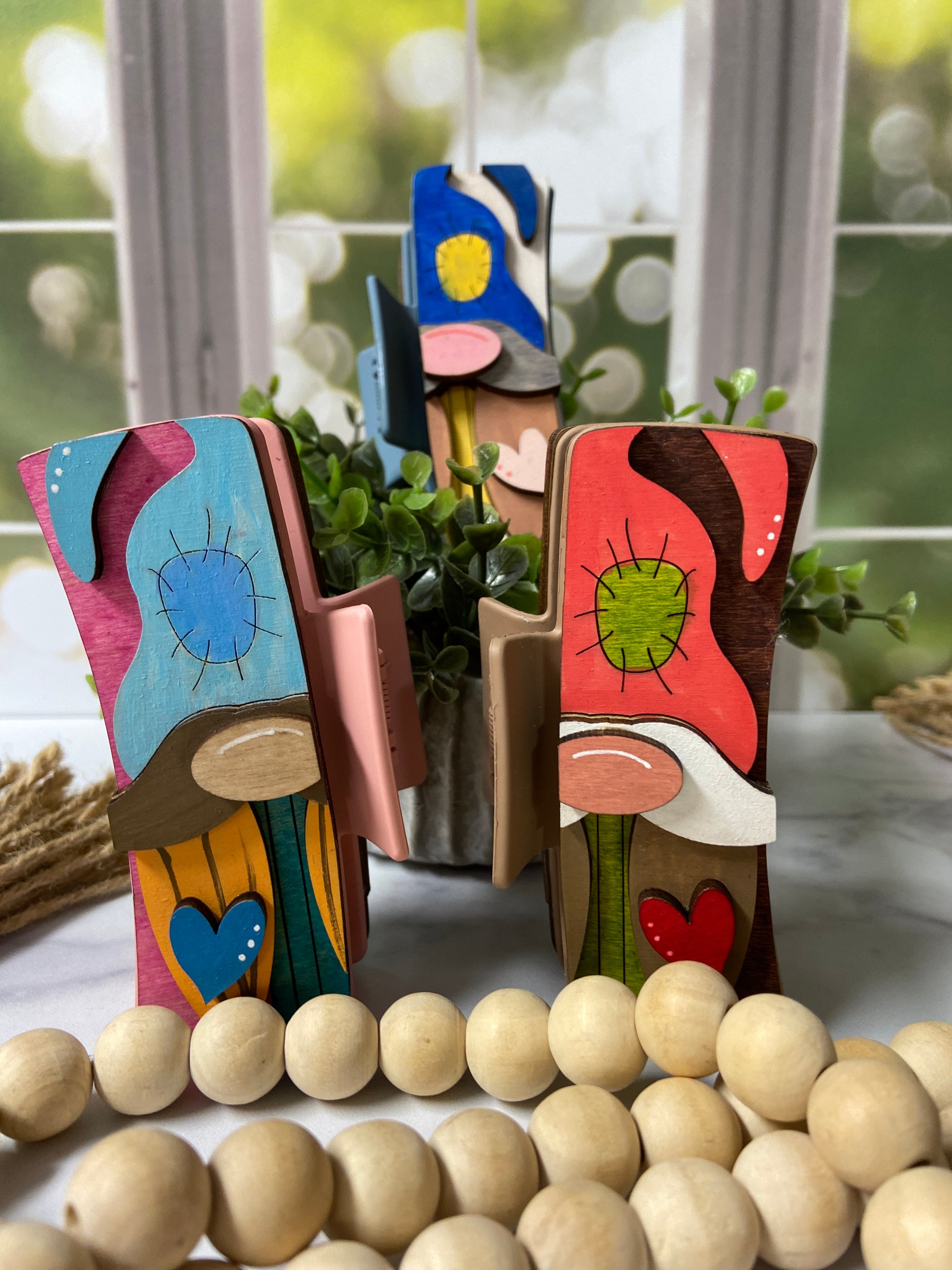 Add some whimsical charm to any hairstyle with our 4 inch Gnome Hair Clips! These laser engraved and hand painted clips feature a cute heart design that adds a unique touch to your look. The colorful variations make each set one-of-a-kind. Perfect for any lover of gnomes or cute accessories. COLOR WILL VARY