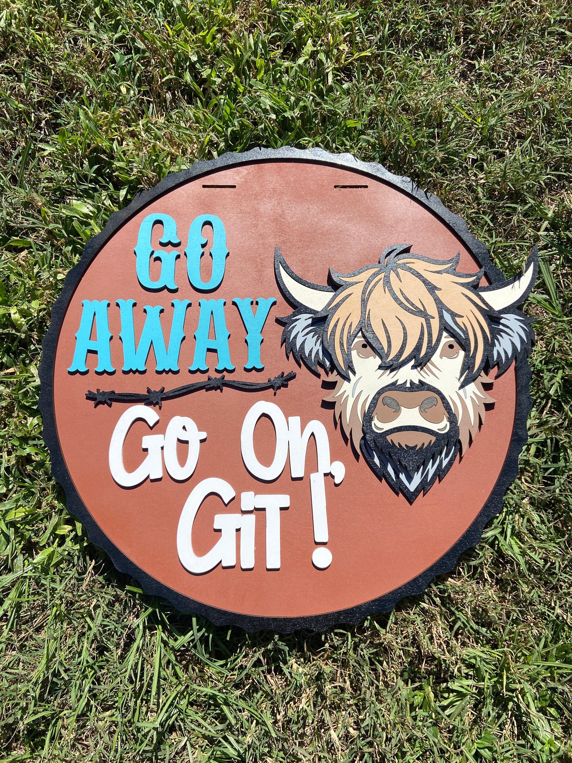 This Go On Git Highland Cow welcome sign and door hanger is crafted from 16 inches of round wood and features intricate laser cutting and hand painting detail. Add a touch of warmth and charm to any entrance with this unique and eye-catching piece.