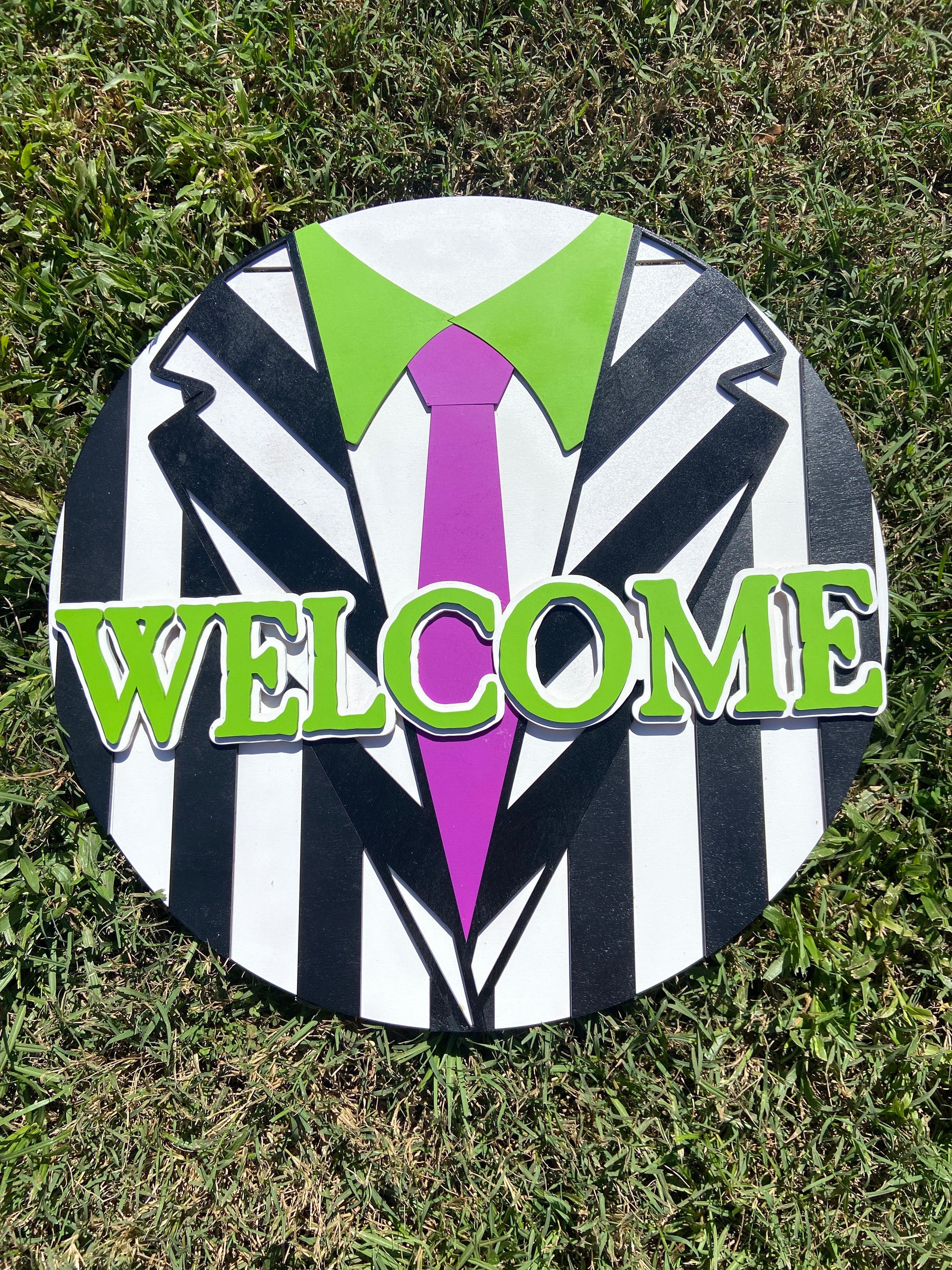 Expertly crafted, this 16' laser cut Green and Black Welcome Door Hanger is made from high-quality wood and hand painted for a stunning finish. Adorn your door with this elegant piece and make a statement. Durable and unique, it is sure to add a touch of sophistication to any entryway.