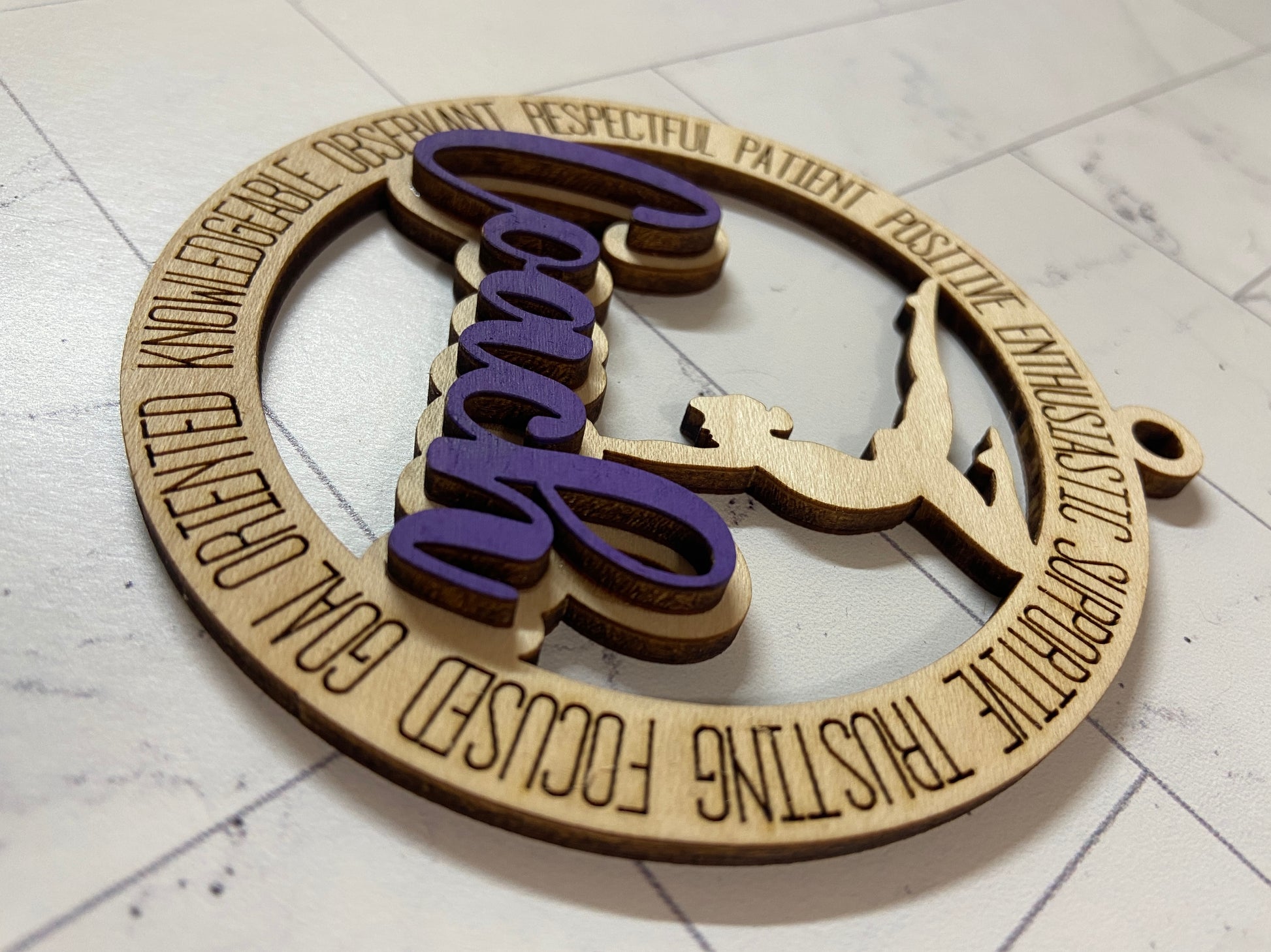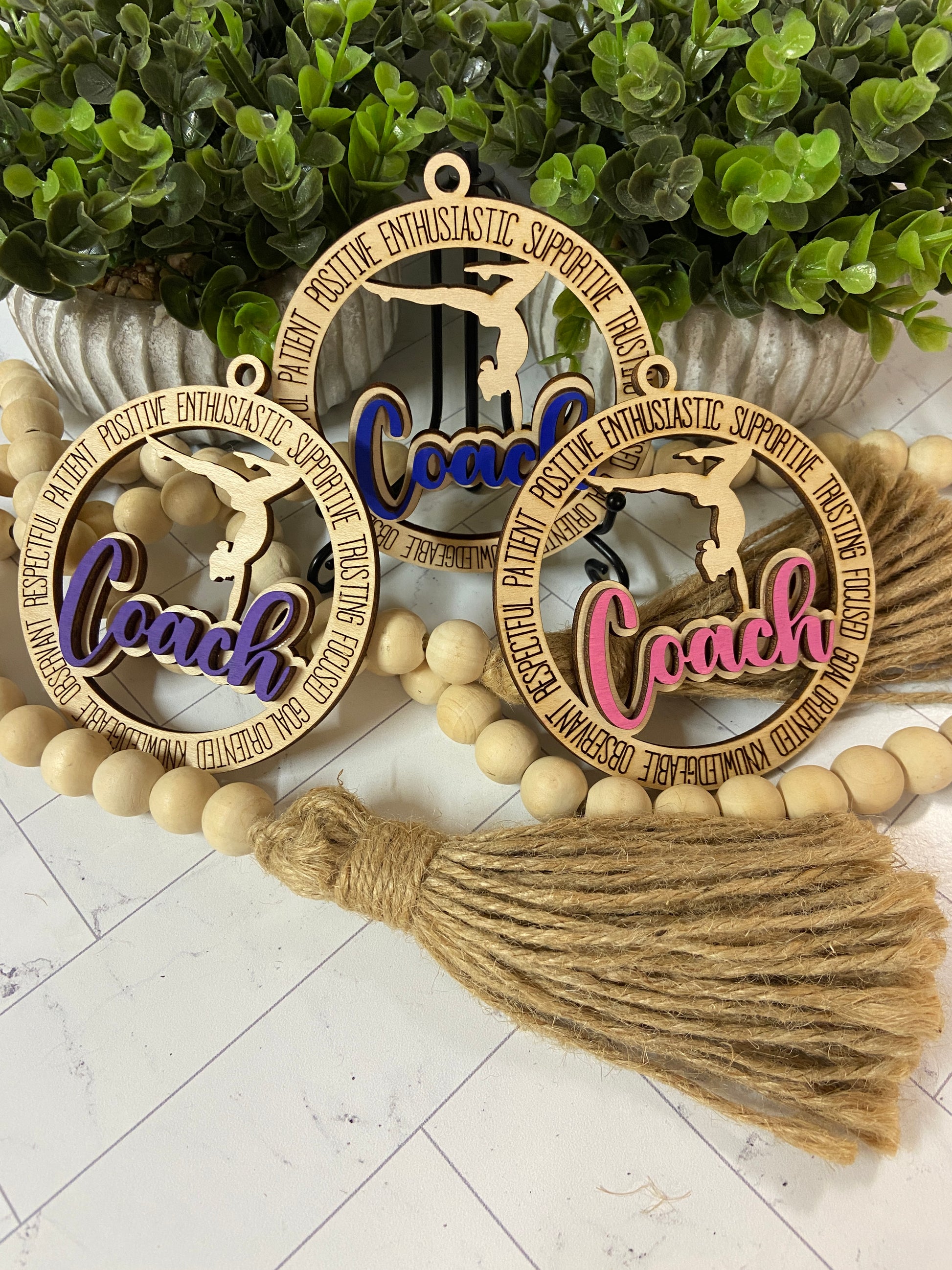 Add a touch of athleticism to your holiday decor with our Gymnastic Coach Ornament. This 3.5 in X 4 in ornament is laser cut and engraved, and hand painted or stained in your choice of colors. Show off your love for gymnastics with this unique and customizable piece.