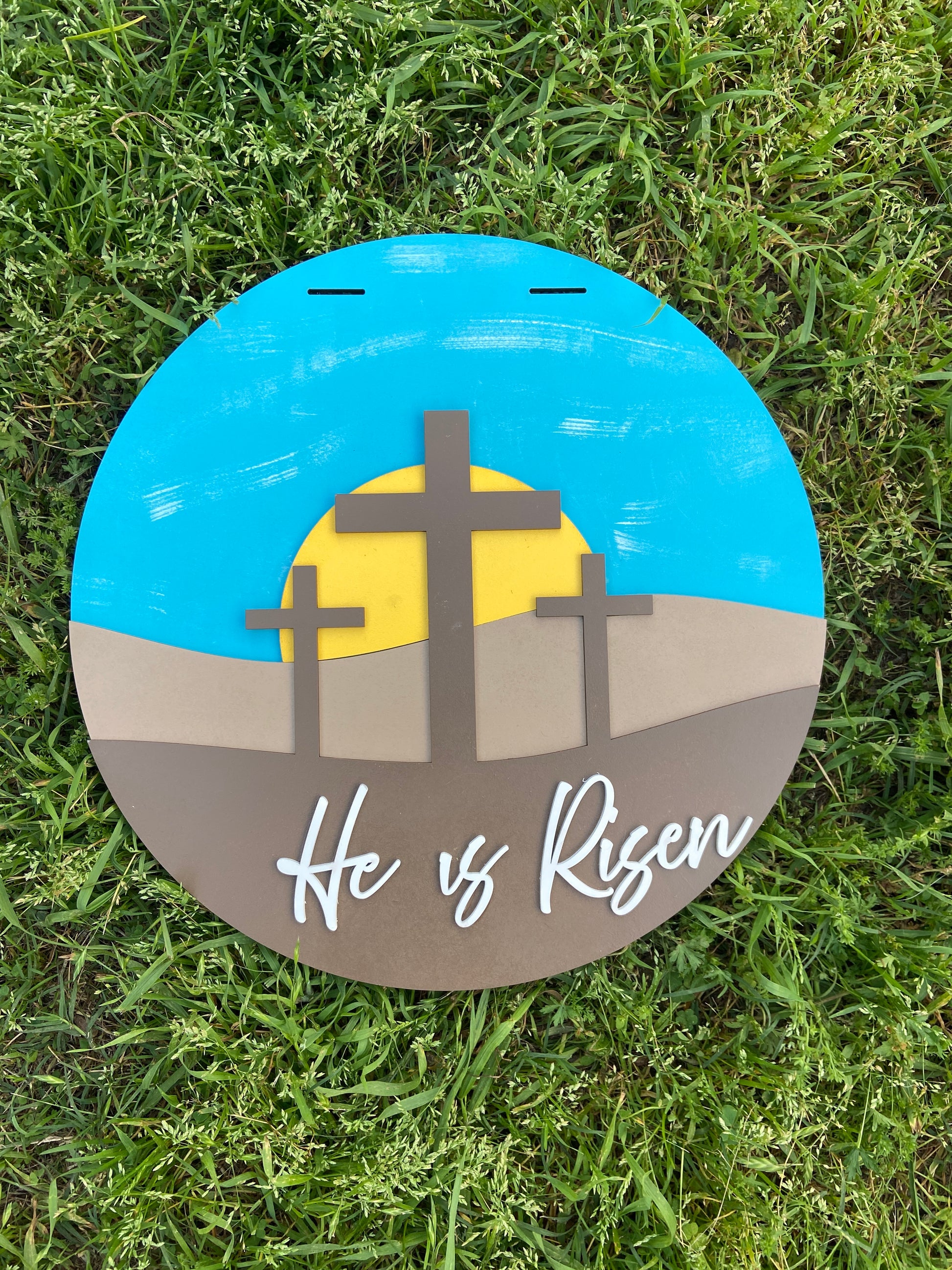 Enhance your door with our He is Risen Cross Door Hanger. Hand painted and laser cut, this 16in round piece is made on demand and is completely unique with its varying colors. Perfect for adding a touch of beauty and faith to your home.