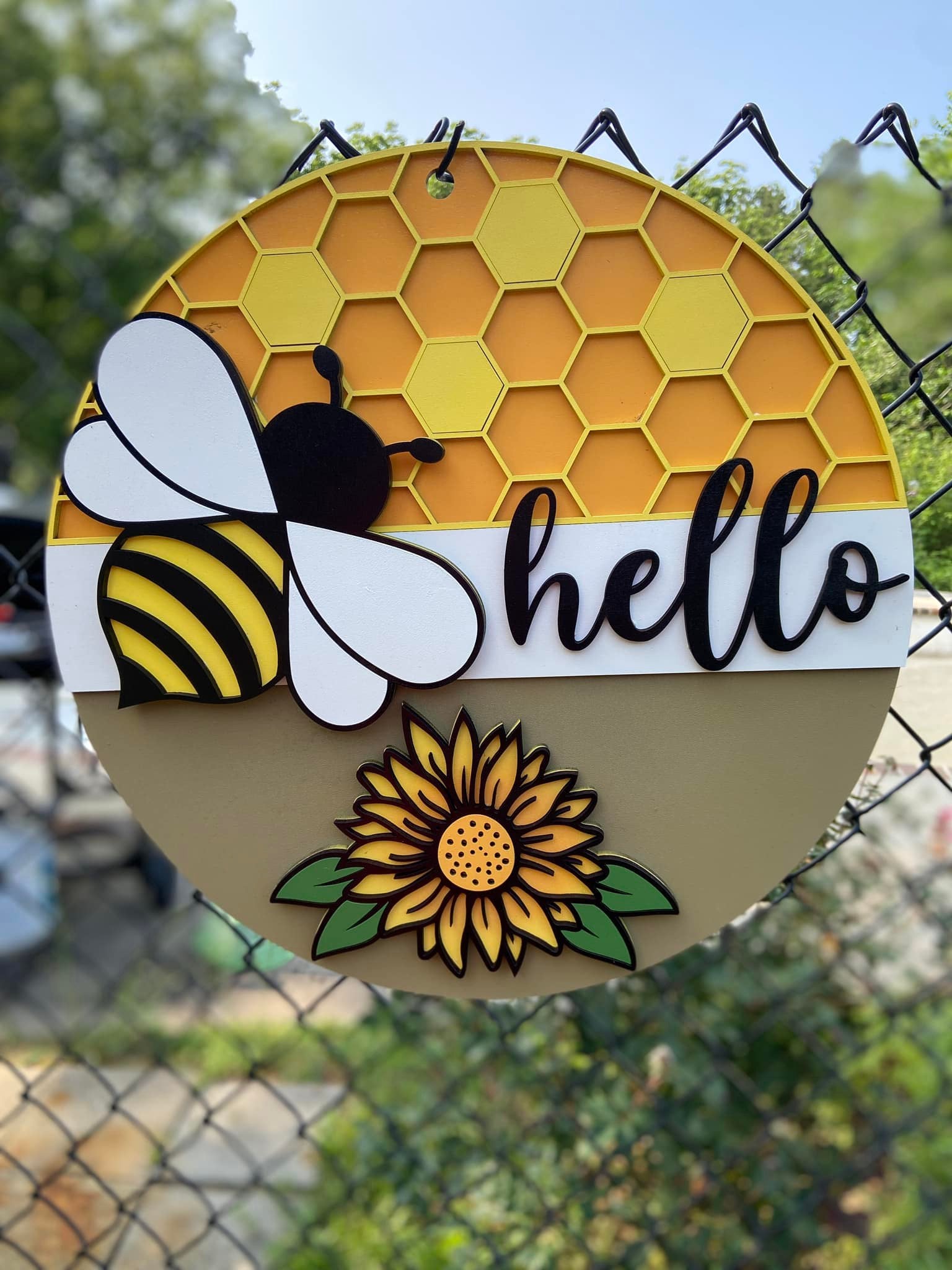Add a touch of charm to your home with our Hello Bee With Flower Door Hanger. Designed with precision, our 18-inch hanger is expertly laser cut, hand painted or stained, and fully assembled. Bring a cheerful touch to your front door with this delightful bee design.