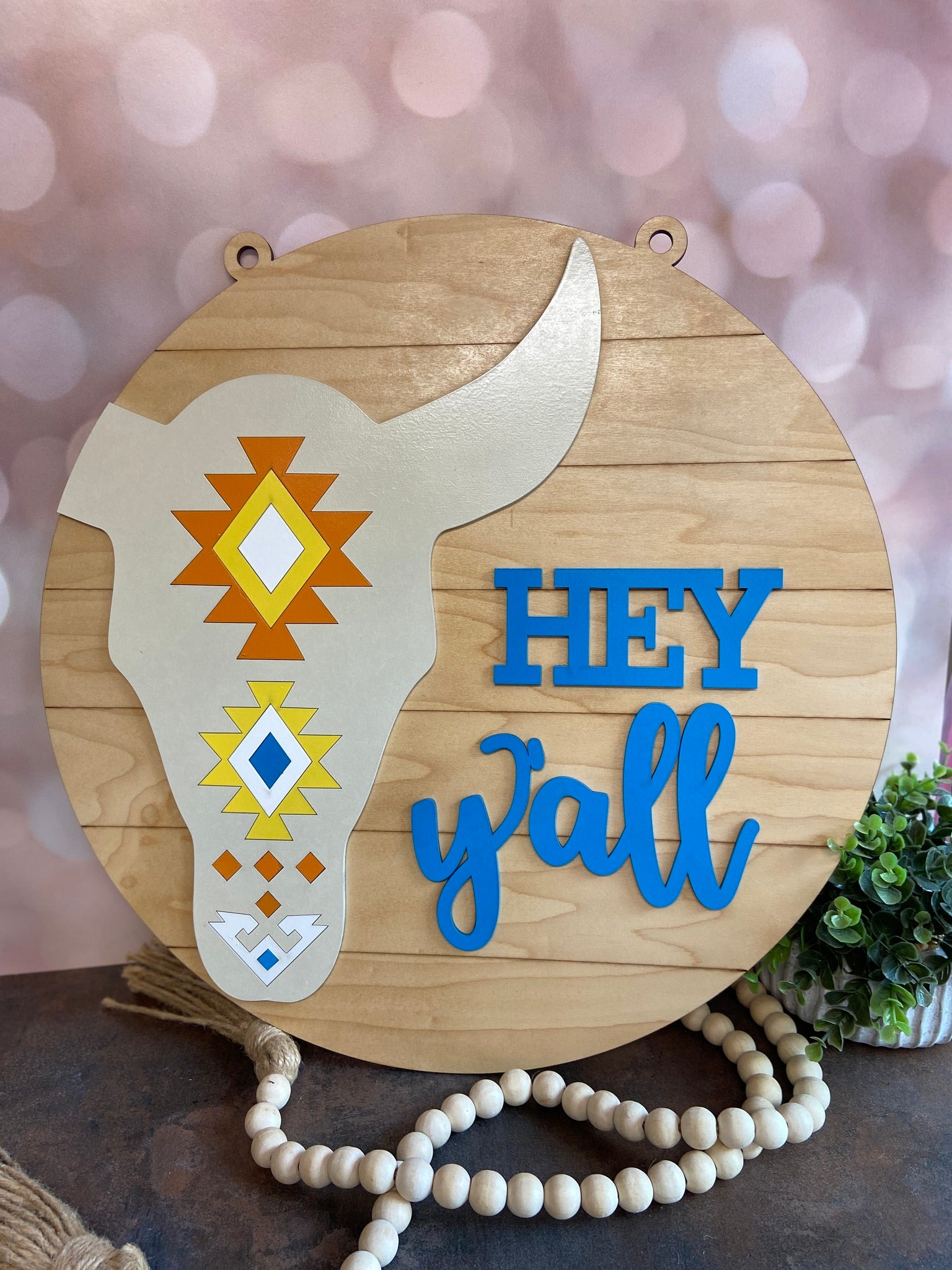 Invite your guests with a warm Southern welcome using our Hey Y'all Door Hanger. This 16 inch round door hanger is laser cut and hand painted or stained for a beautiful Western touch. A perfect addition to any home.