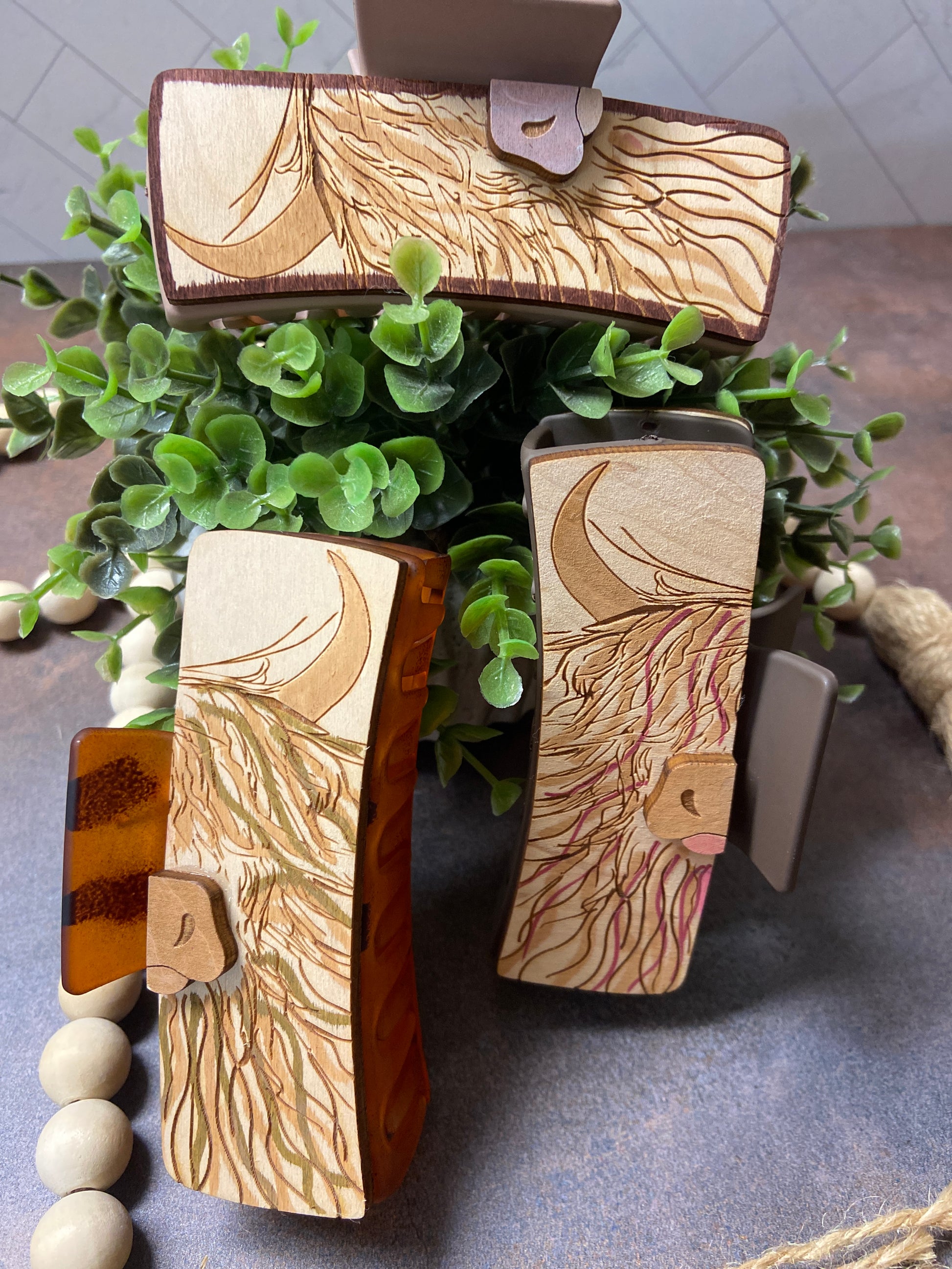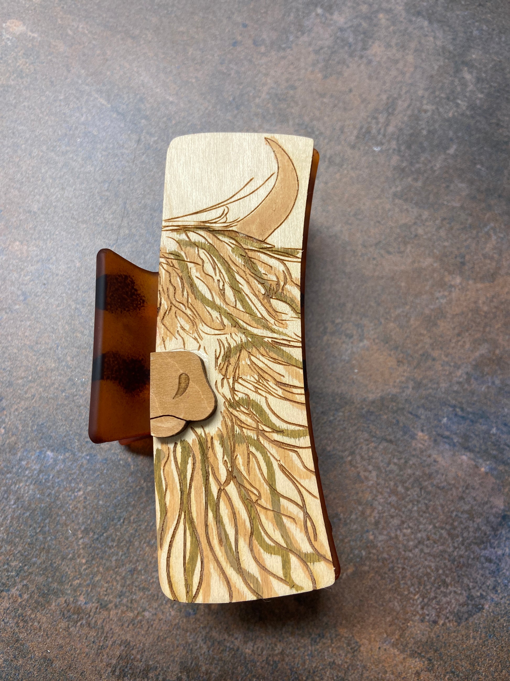 Enhance your hair with our beautifully crafted Highland Cow Hair Clip. Each clip is laser cut and engraved, then hand painted for a unique touch. At 4 inches long, it's perfect for holding your hair in place while adding a stylish touch. Colors may vary, making each clip one-of-a-kind. Get yours today!