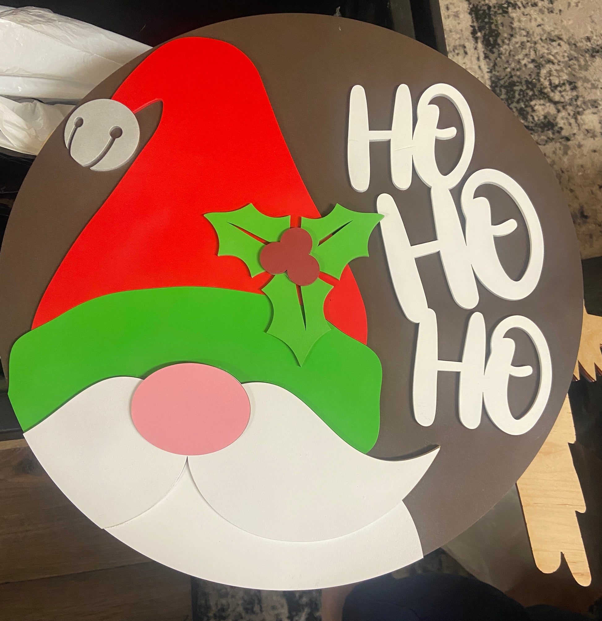 Add some holiday cheer to your front door with our Ho Ho Ho Gnome Santa door hanger. Expertly crafted with laser cut maple wood and MDF, this 18 inch round hanger is hand painted or stained for a charming touch. Spread joy and laughter with this festive and unique decoration.