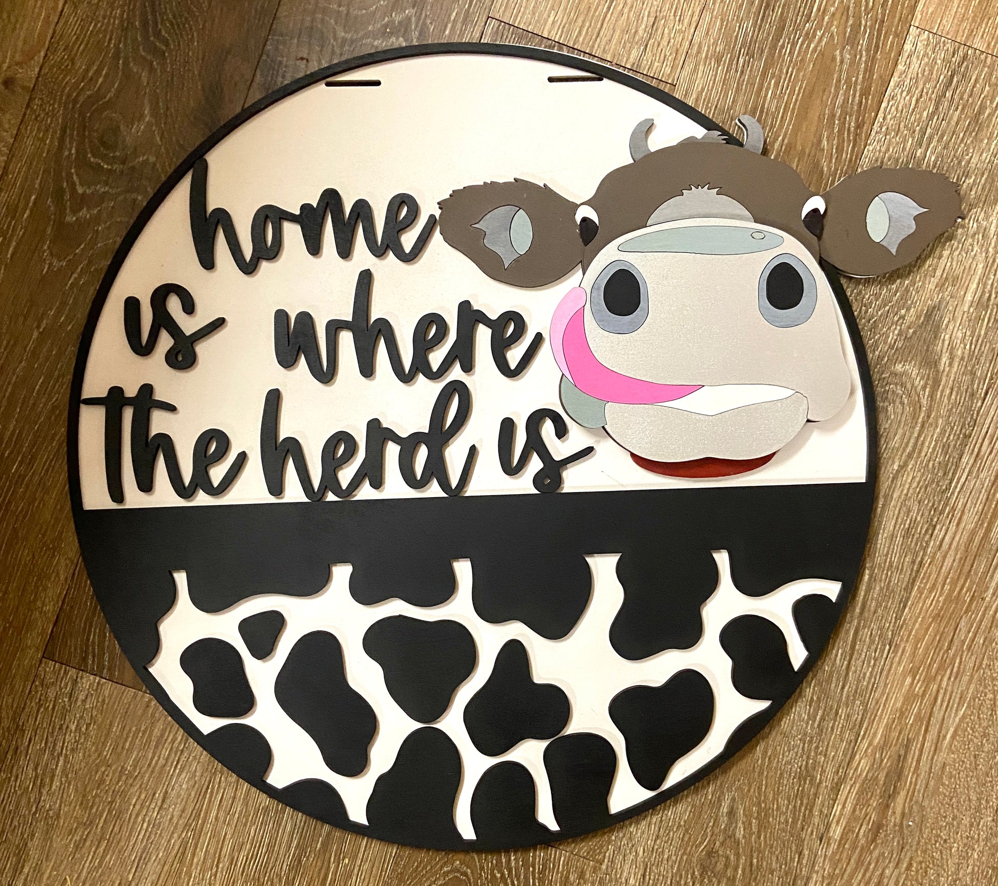 Elevate your home's entrance with our adorable Home is where the Herd is Door Hanger. Measuring 18 inches and hand painted, this laser cut cow door hanger adds a charming touch to your front door. Delight your visitors with a cute cow that is sure to bring a smile to their face.