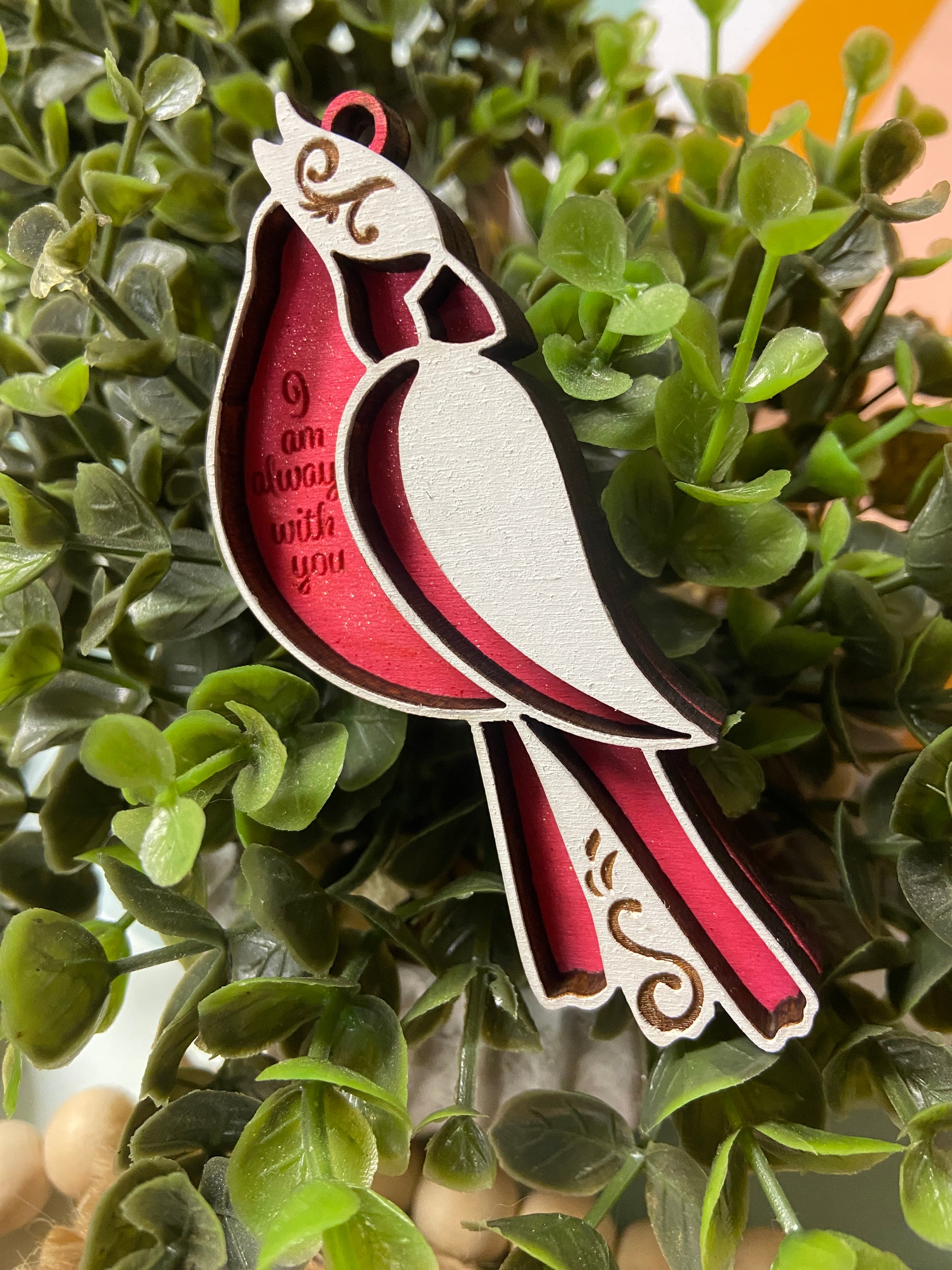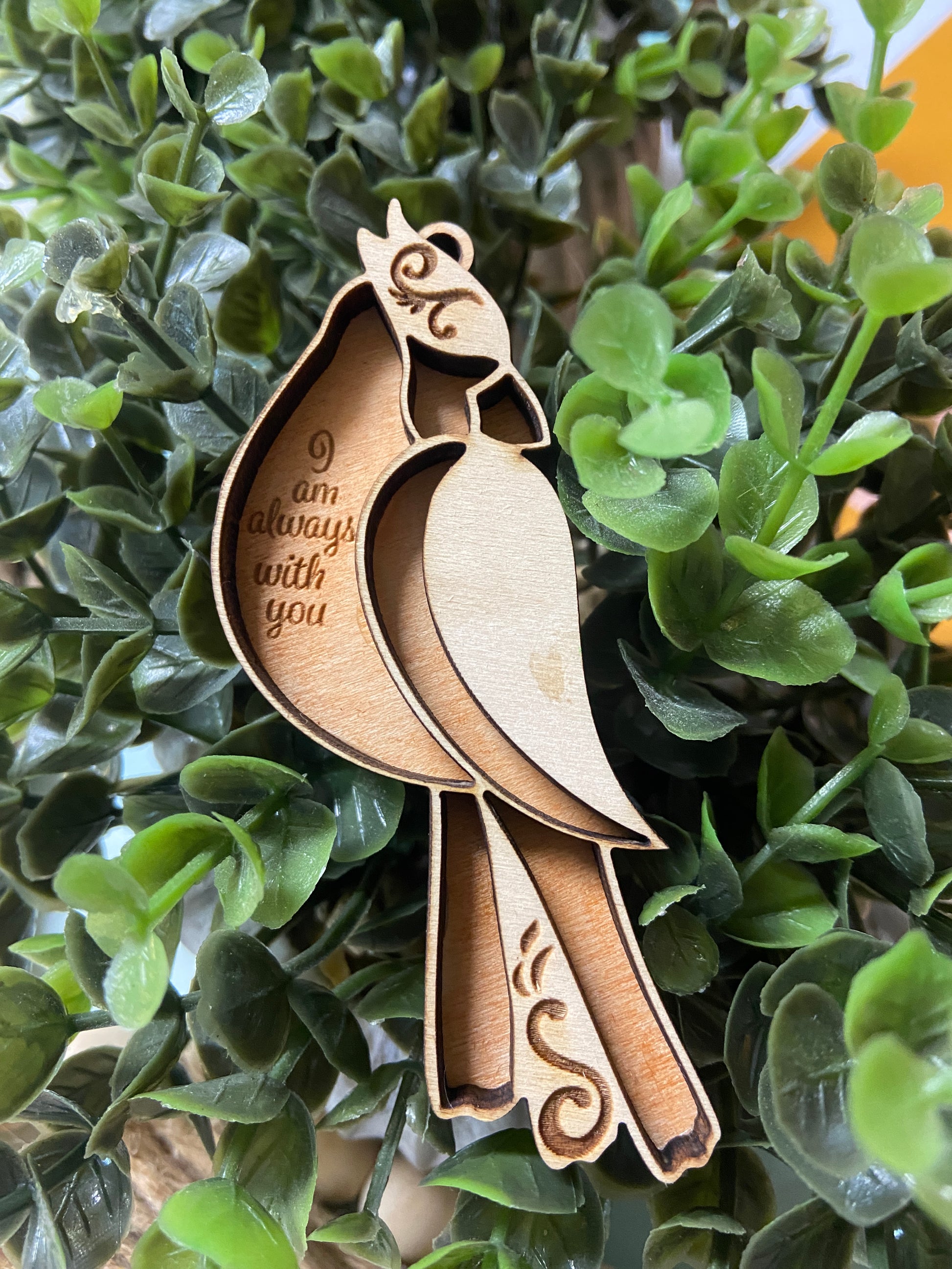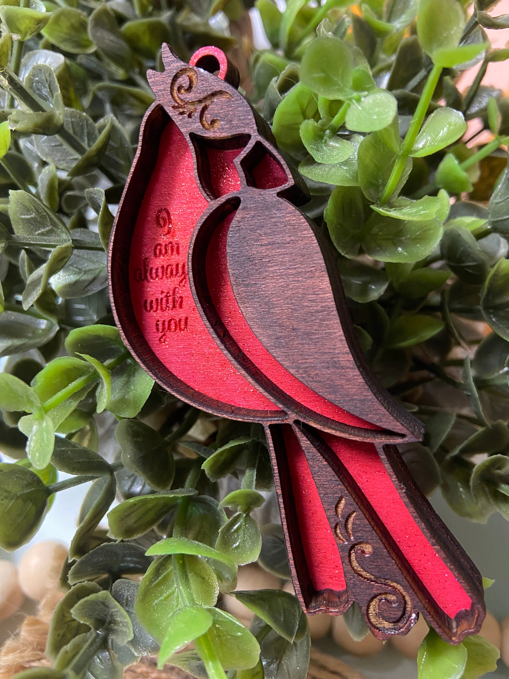 This laser cut and engraved Memorial Cardinal ornament called "I am always with you 2" is a beautiful addition to any space. Hand painted or stained, it features a red bird and the words "I am always with you" to serve as a comforting reminder. Colors may vary for a unique touch.Measurements 2.1 X 3.5 inches