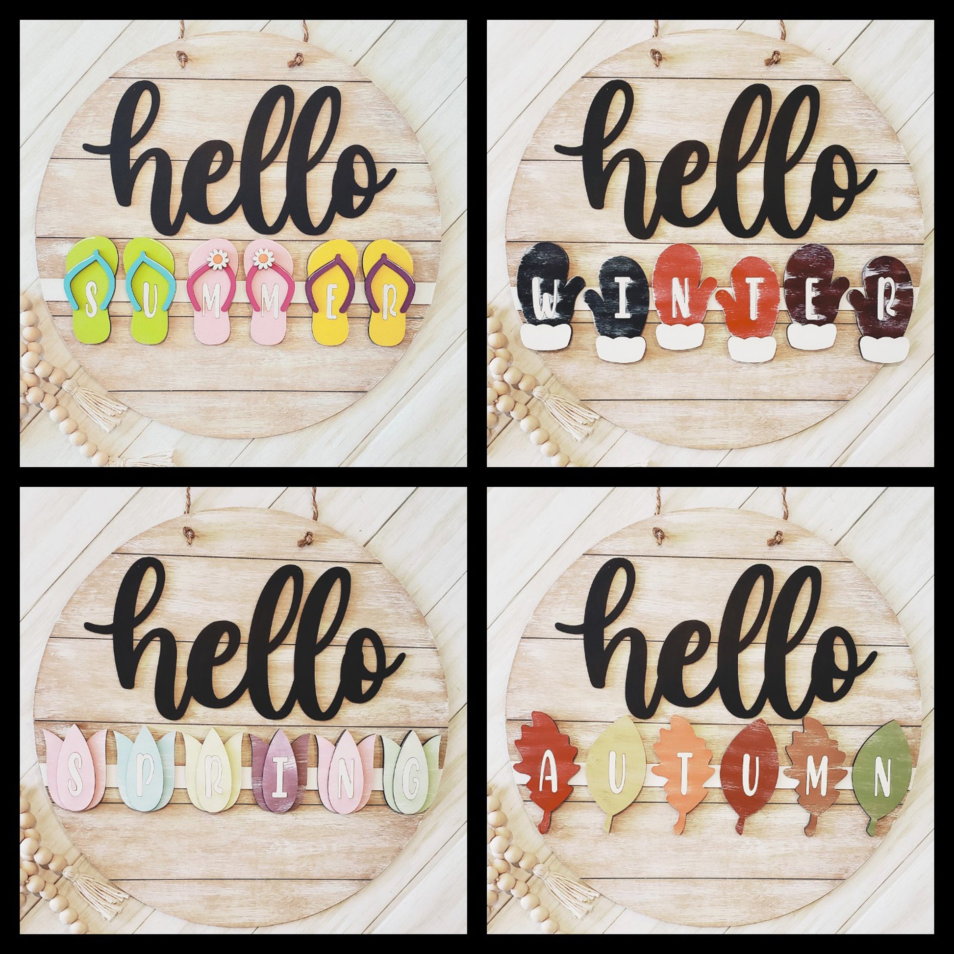 Adorable door hanger that comes with 4 interchangeable seasons to meet your needs. One design with 4 addons. Summer, Winter, Spring and Autumn and it is 3 layers. Color may be different due to different types of computer screen and these are hand painted.