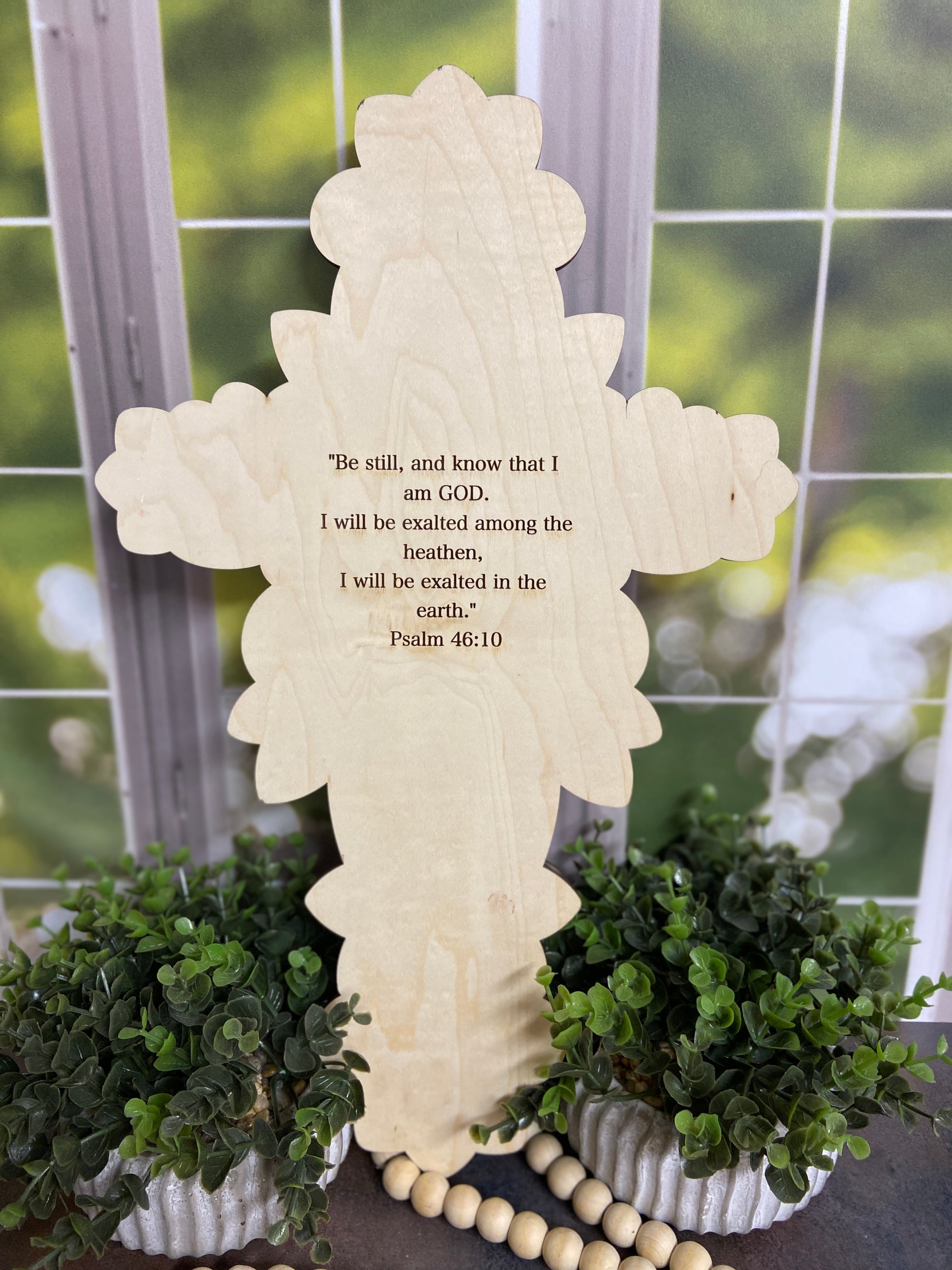 This stunning 4 wood layer cross is breath taking. Each layer is carefully placed and glued together. Colors may vary as wood stain and grain take on slightly different colors. Custom engraving for added price.