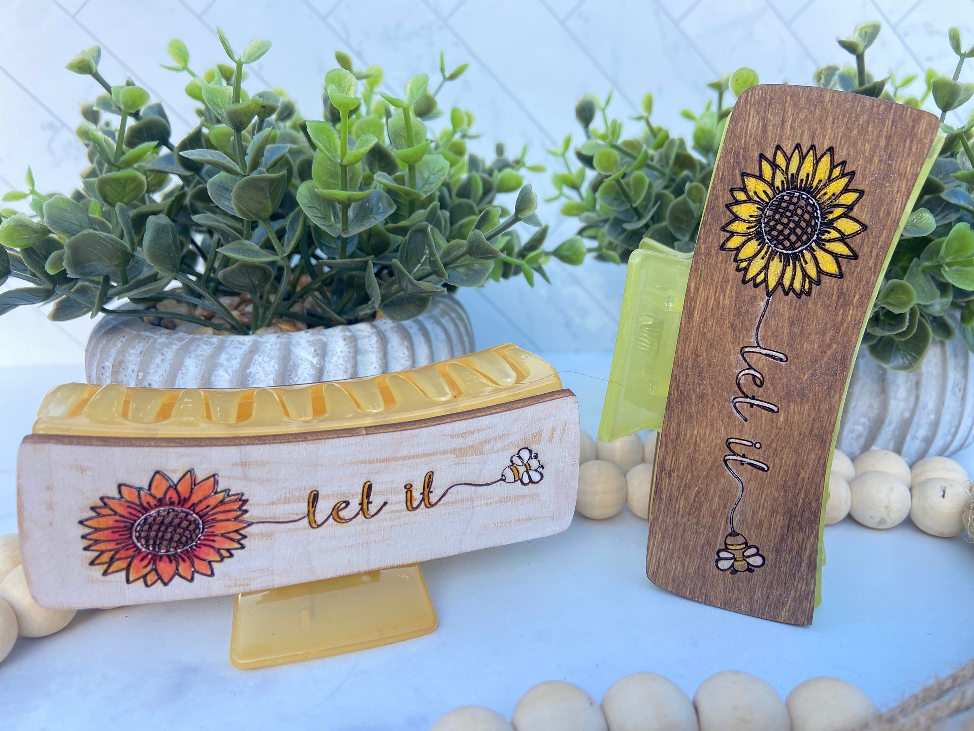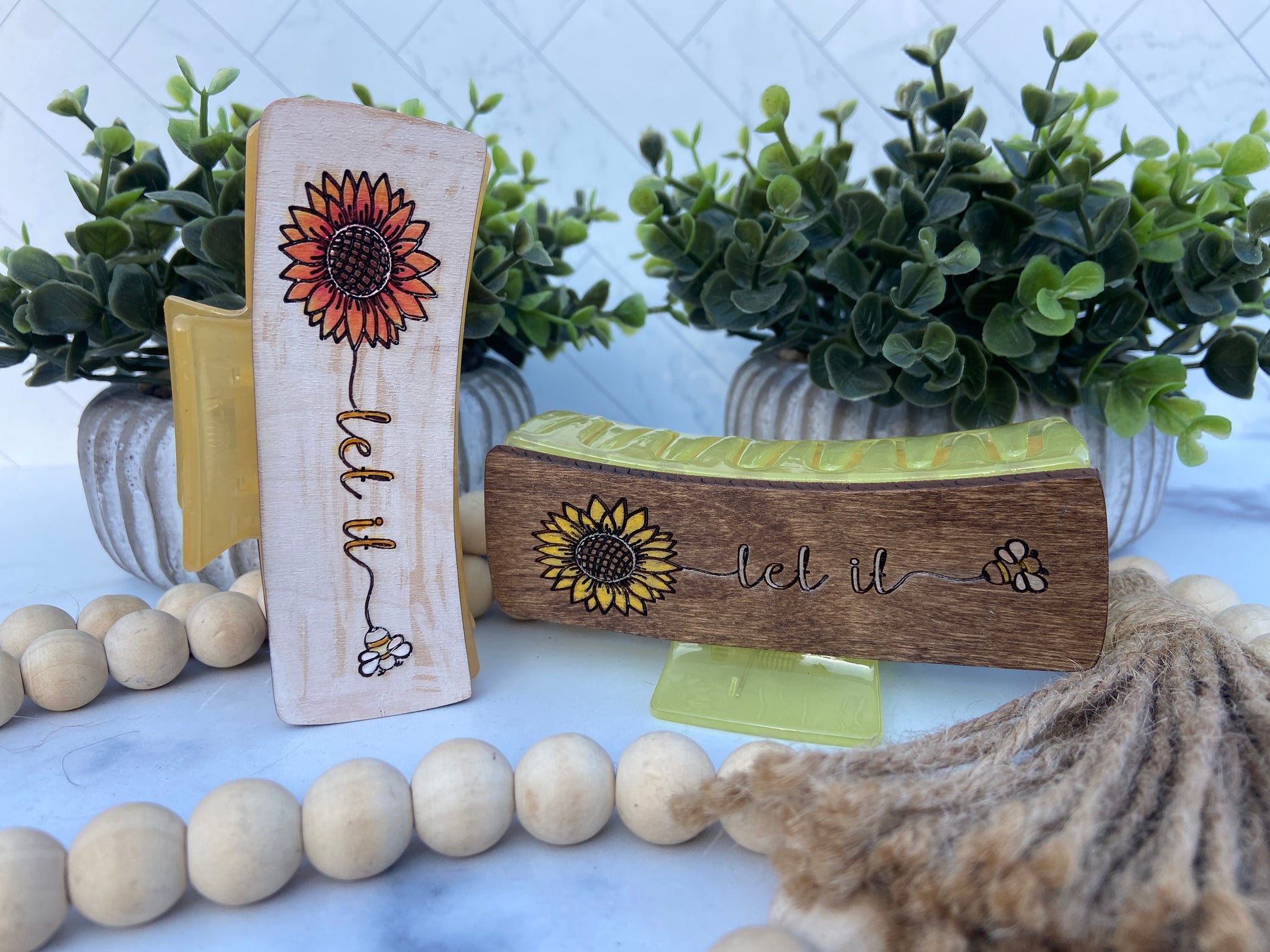 Transform your look with our Let it Bee Hair Clip. Handcrafted using laser cut and engraved techniques, this 4-inch clip is sure to make a statement. Each clip is unique, hand painted or stained with colors that will vary. Elevate your style with this one-of-a-kind accessory.