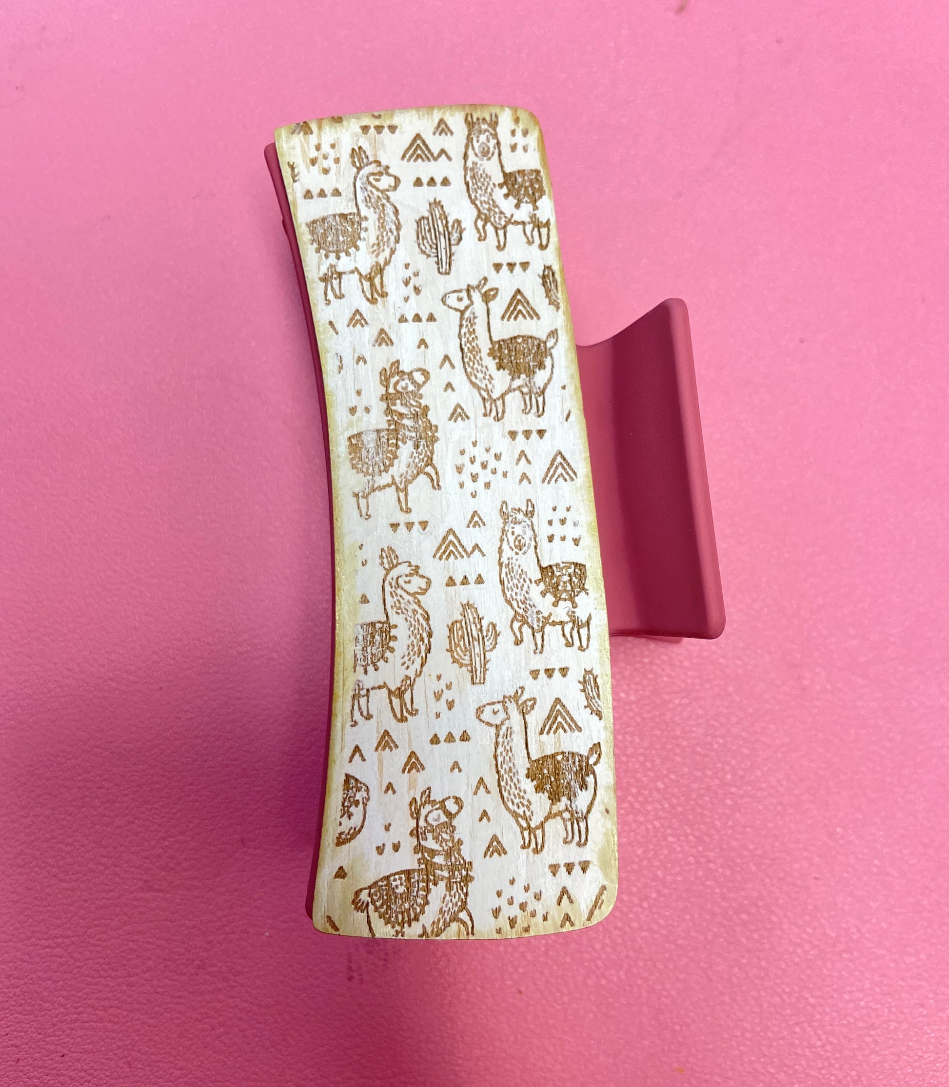 Introducing the Llama Galore Hair Clip, the perfect accessory for all the llama lovers out there! Expertly laser cut and engraved, this 4 inch clip features a cute design with multiple llamas, hand painted and made to order with varying colors. Get ready to add some llama love to your hair!