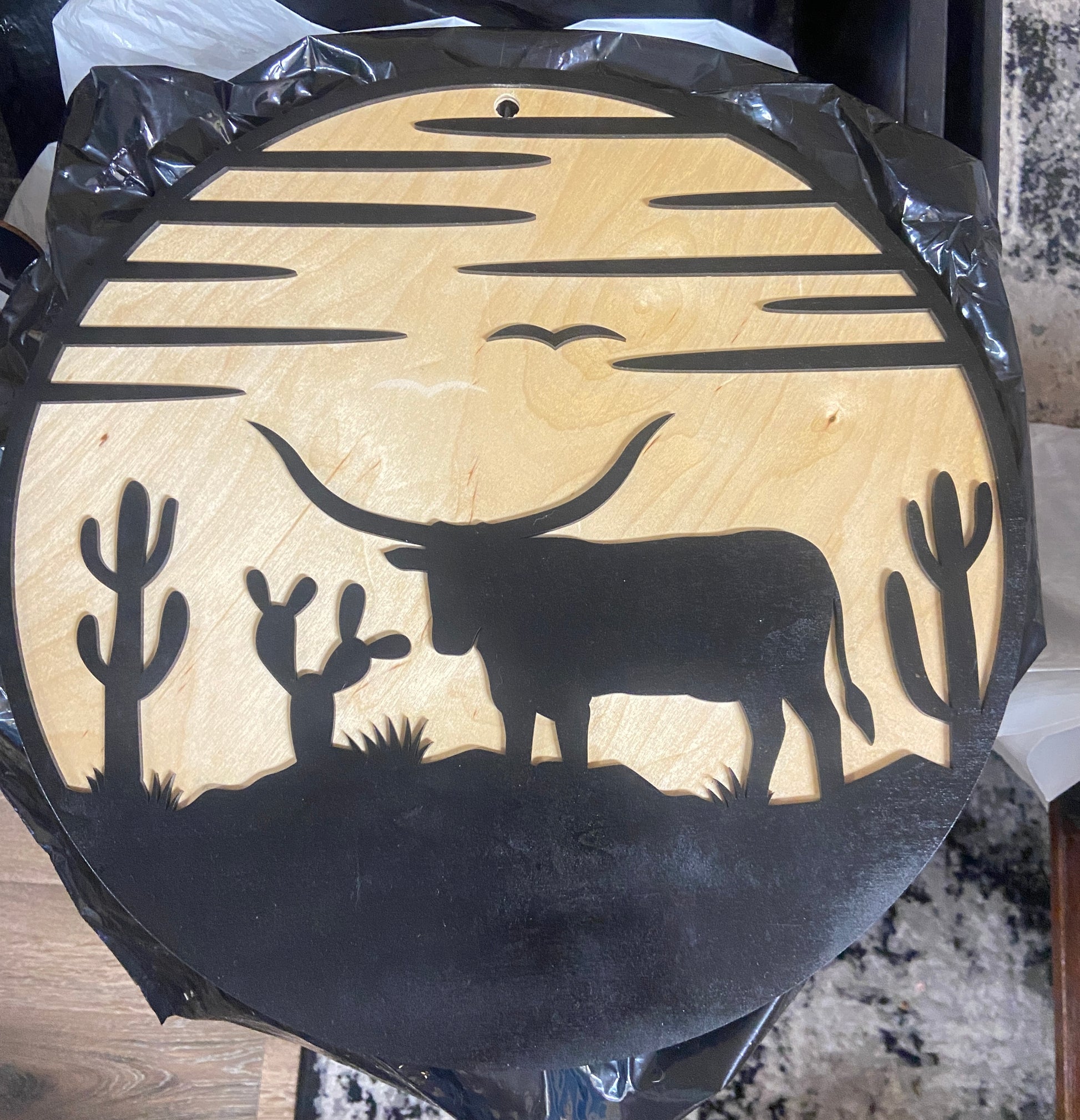 Elevate your home decor with our Long Horn Silhouette Door Hanger. This 16 inch round, laser cut and hand painted/stained masterpiece is perfect for rodeo enthusiasts or anyone looking for a unique statement piece. Its intricate design and high-quality craftsmanship will leave a lasting impression.