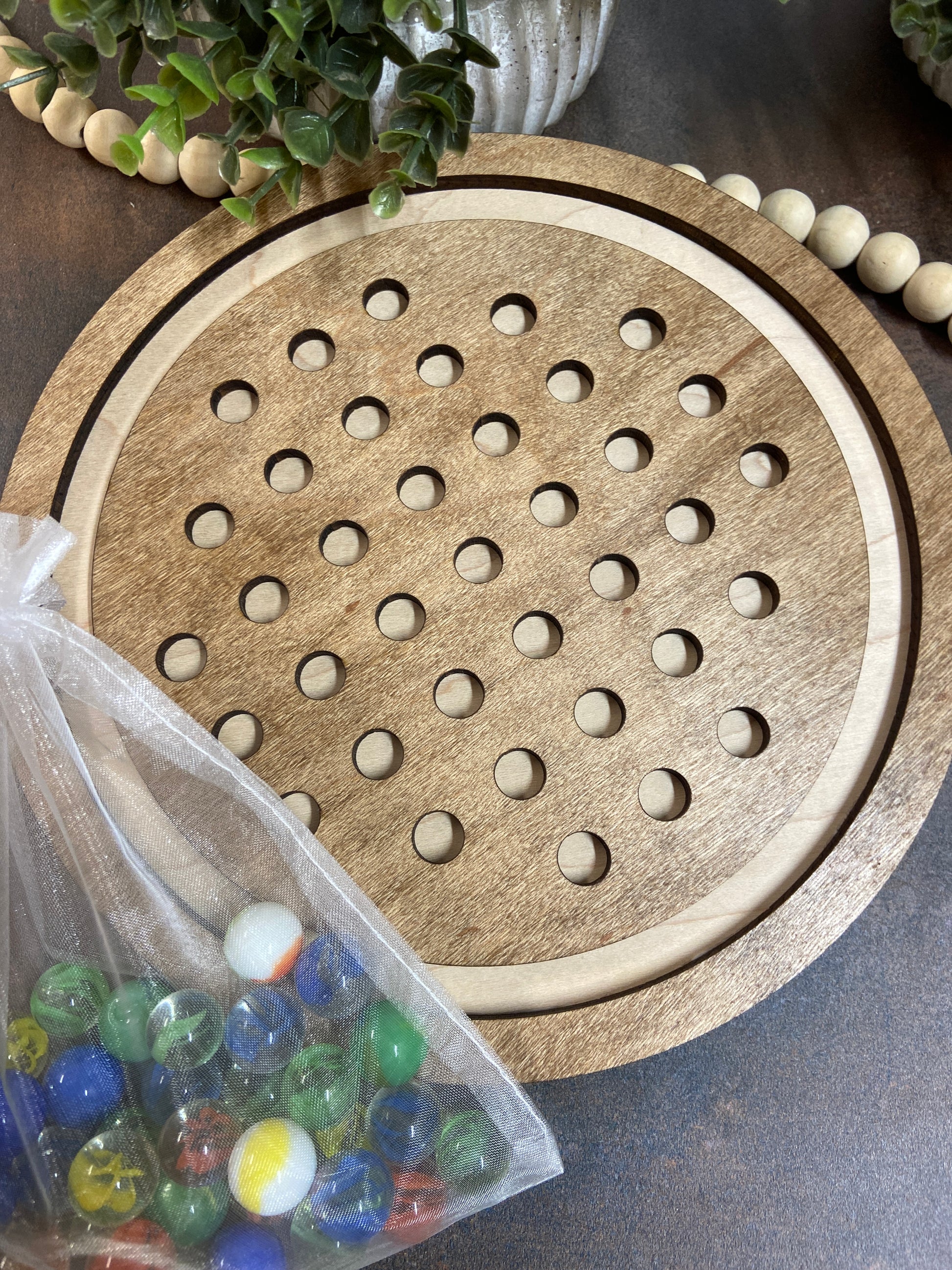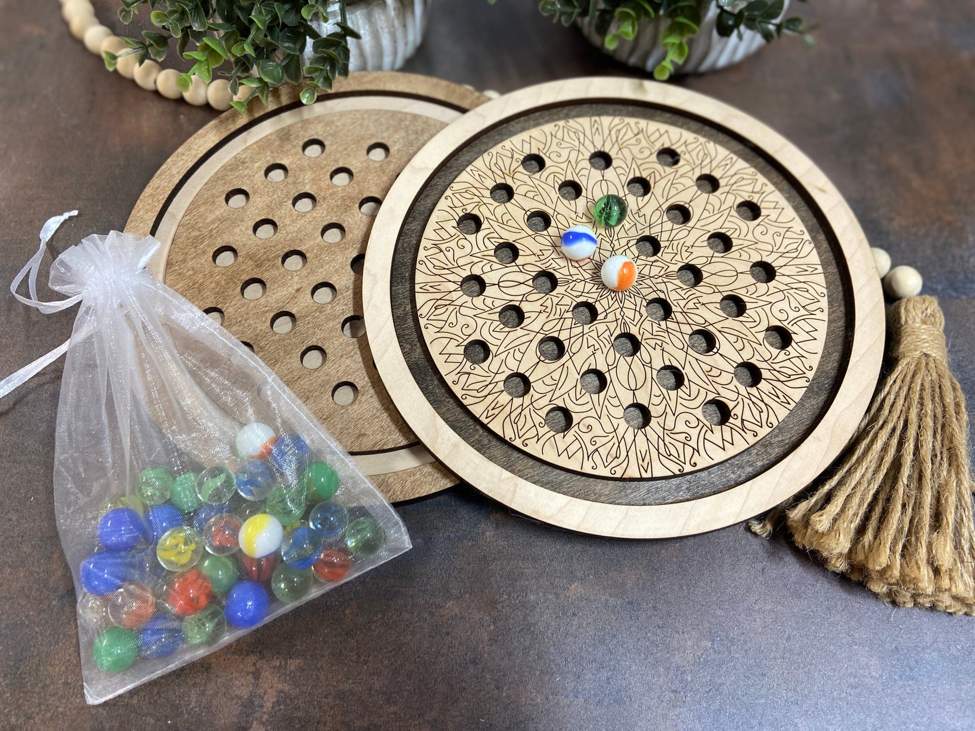 Play two classic games in one with the Marble Solitaire Game. With 36 marbles included, this handcrafted, laser-cut and hand-painted game provides endless fun and challenge. Instructions for both Marble Solitaire and Fox & Geese are included, making this game perfect for all ages. Measurements are approx. 9X9 circle.