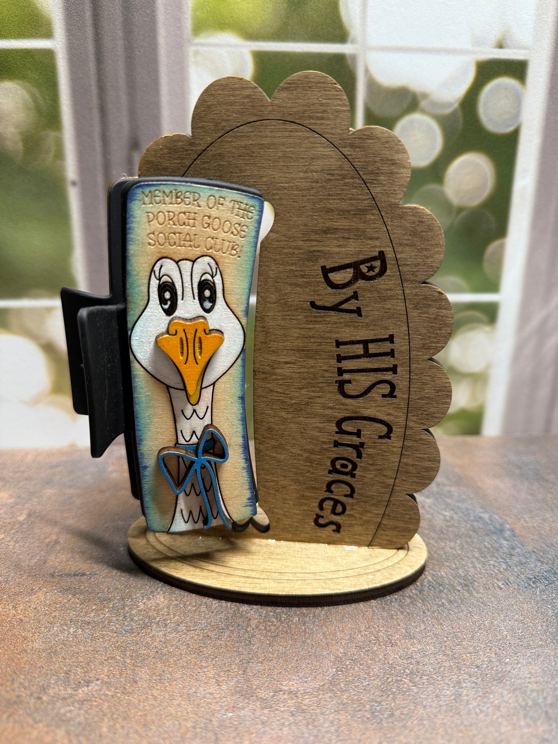 This charming 4-inch hair clip features a laser-cut and engraved porch goose design, meticulously hand-painted and stained for authentic character. Each piece is individually crafted, ensuring unique color variations that celebrate the artisanal nature of the work. Perfect for adding a whimsical, rustic touch to any hairstyle while showcasing quality craftsmanship and attention to detail.