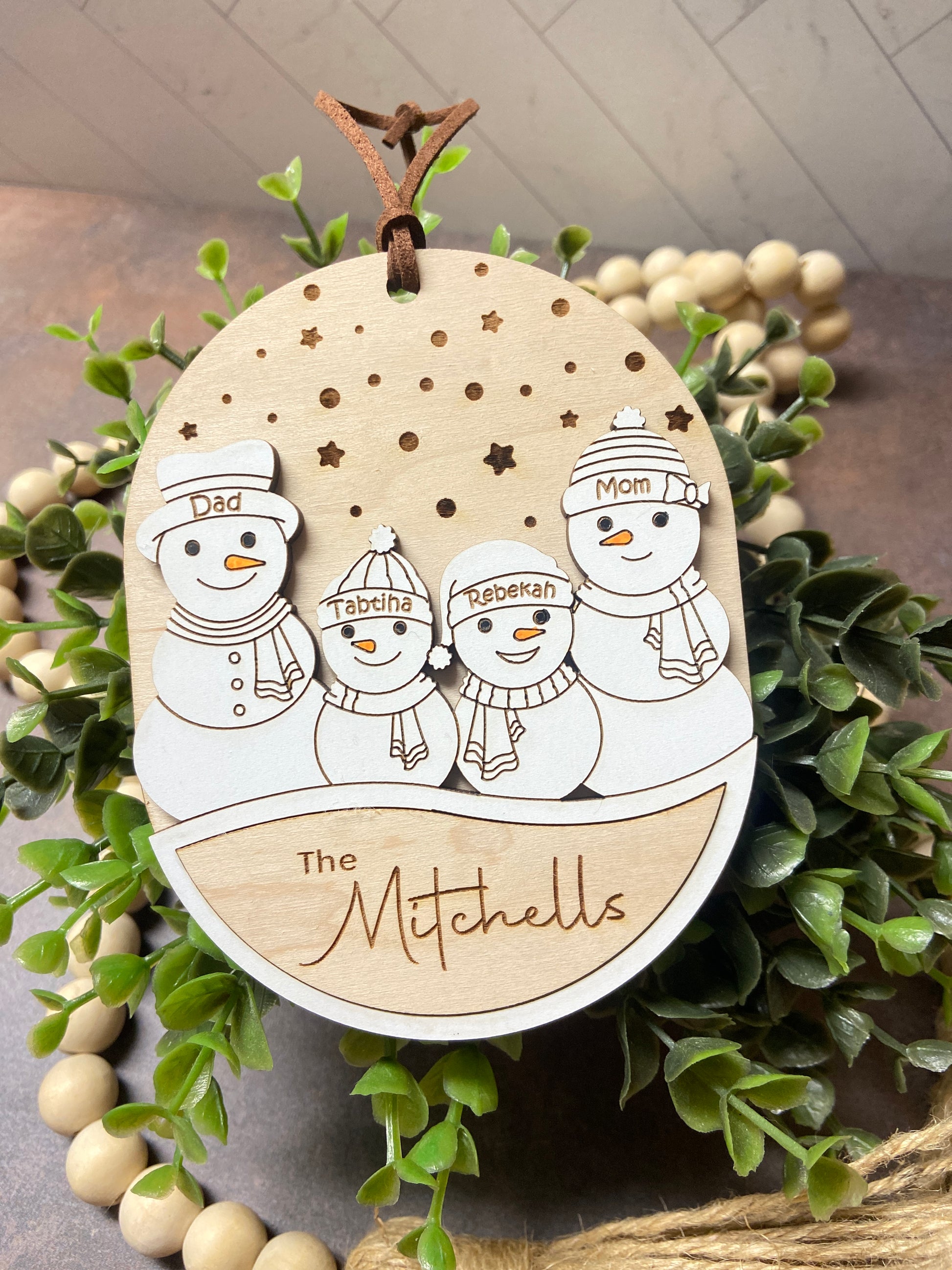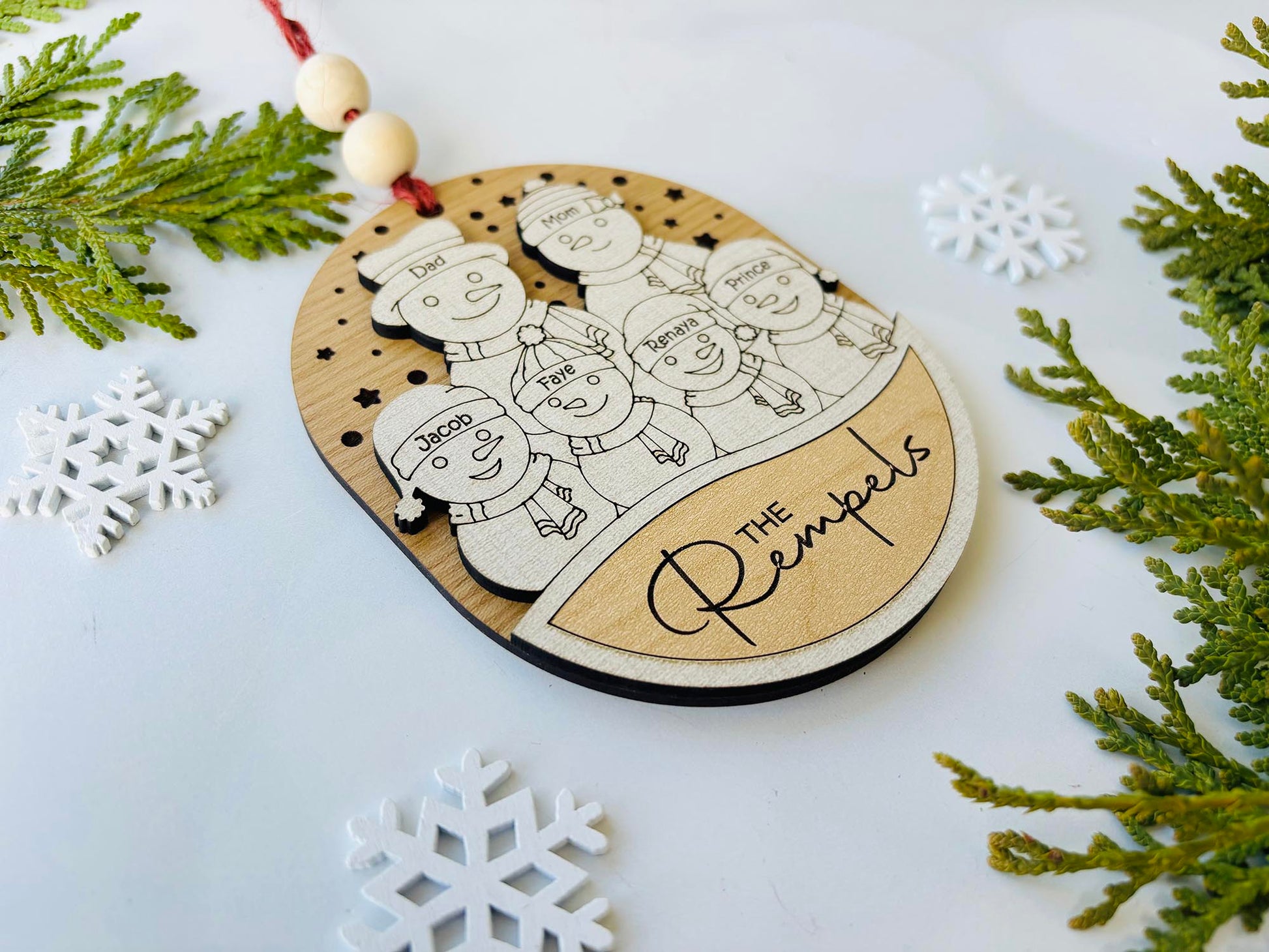 Expertly crafted and personalized, the Laser-cut Snow Family ornament captures the joy and love of your unique family. Engraved with up to 1-2 adults and 6 kids, this charming design measures 3.5x4.5 to perfectly adorn your holiday tree. Celebrate your family bond with this adorable keepsake.
