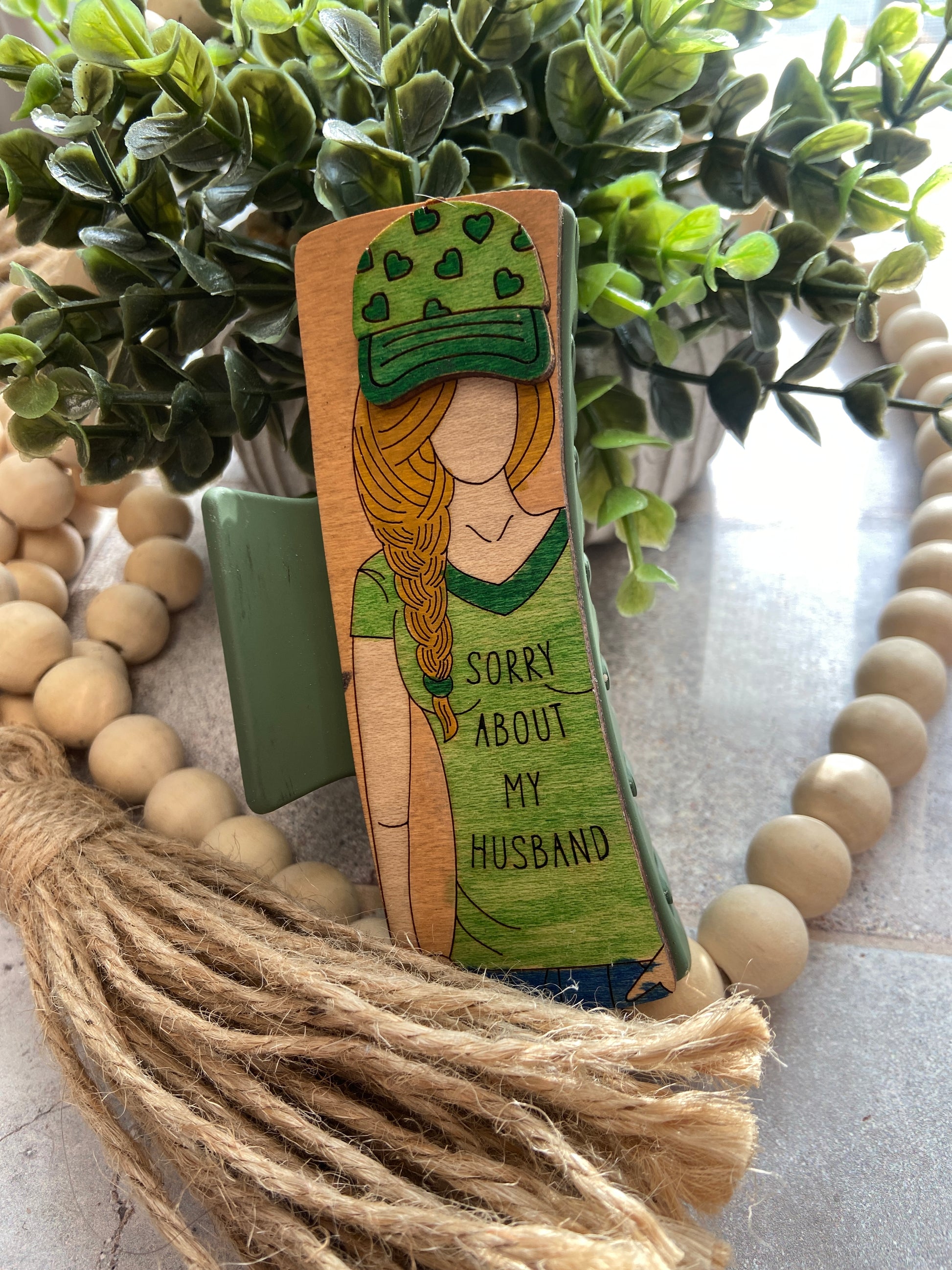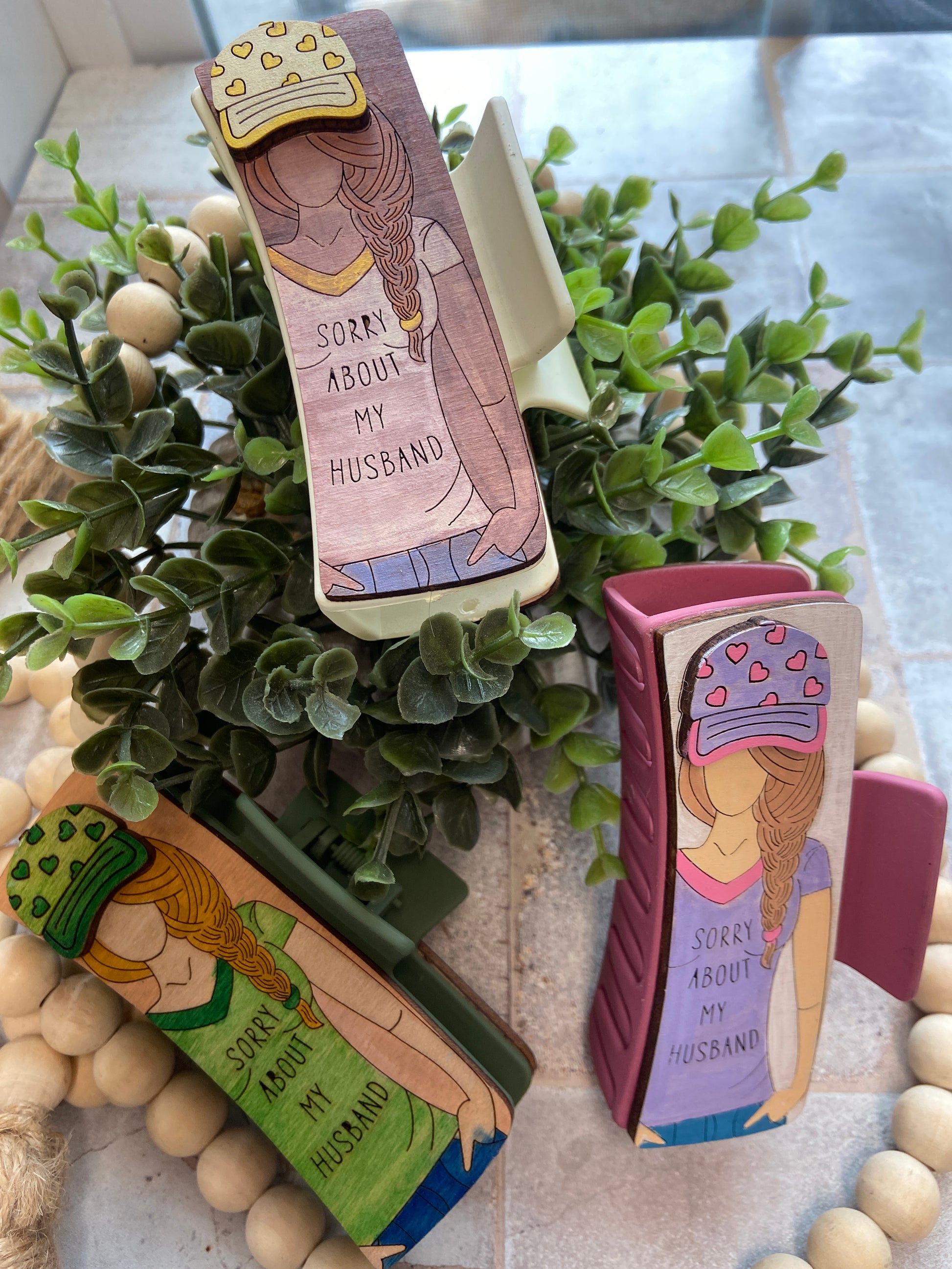 This 4 in laser cut and engraved hair clip is perfect for adding a touch of humor to your hairstyle. Each clip is made on demand, with varying colors. Show off your sense of humor with the "Sorry about My Husband" message.