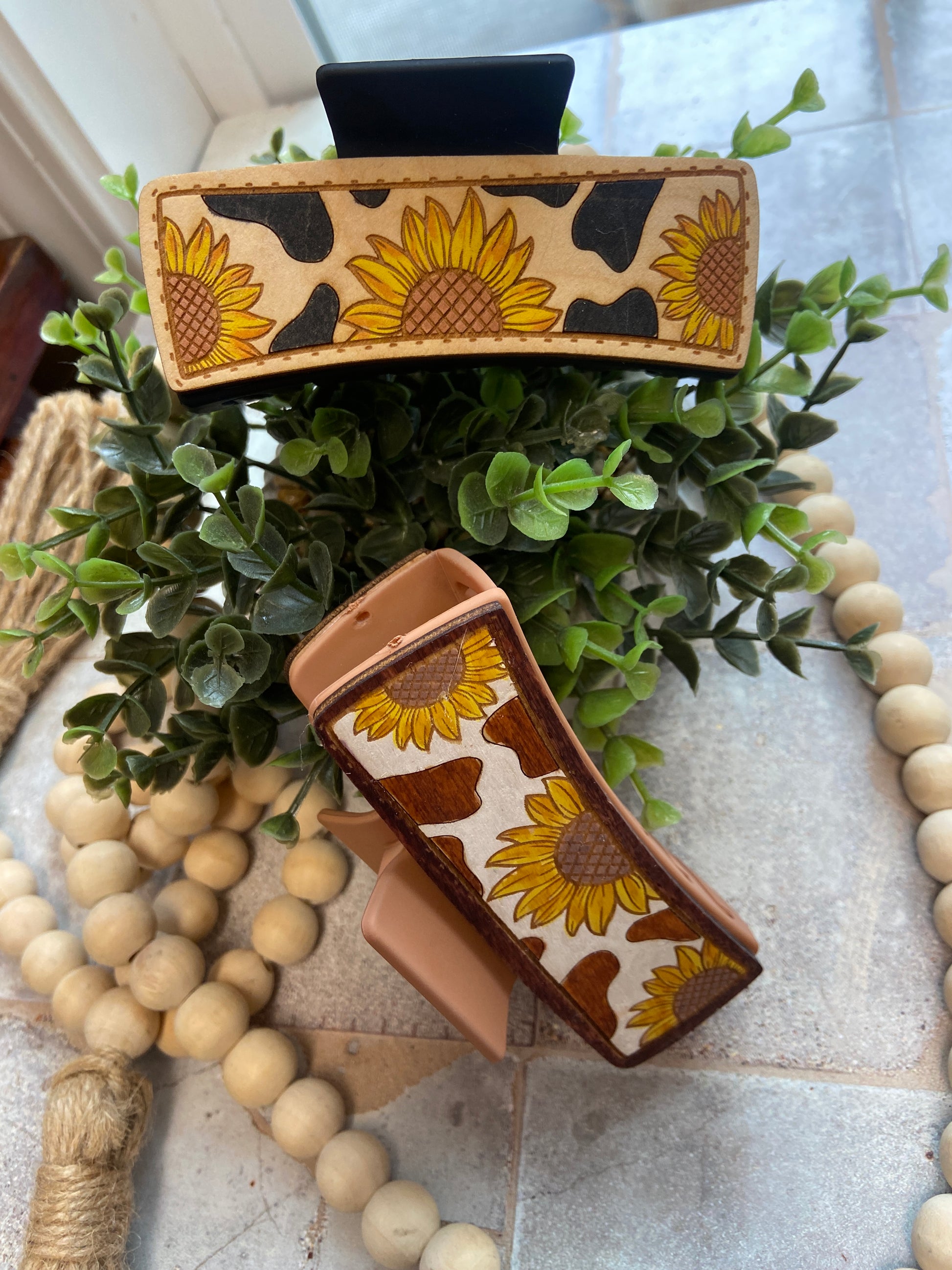 Introducing the must-have accessory of the season: our Sunflower Cow Print Hair Clip. Laser cut and hand painted, this 4-inch clip is guaranteed to add a touch of whimsy and style to any outfit. Each clip is made on demand, ensuring a unique and one-of-a-kind look. Order yours today for a perfect hair day!
