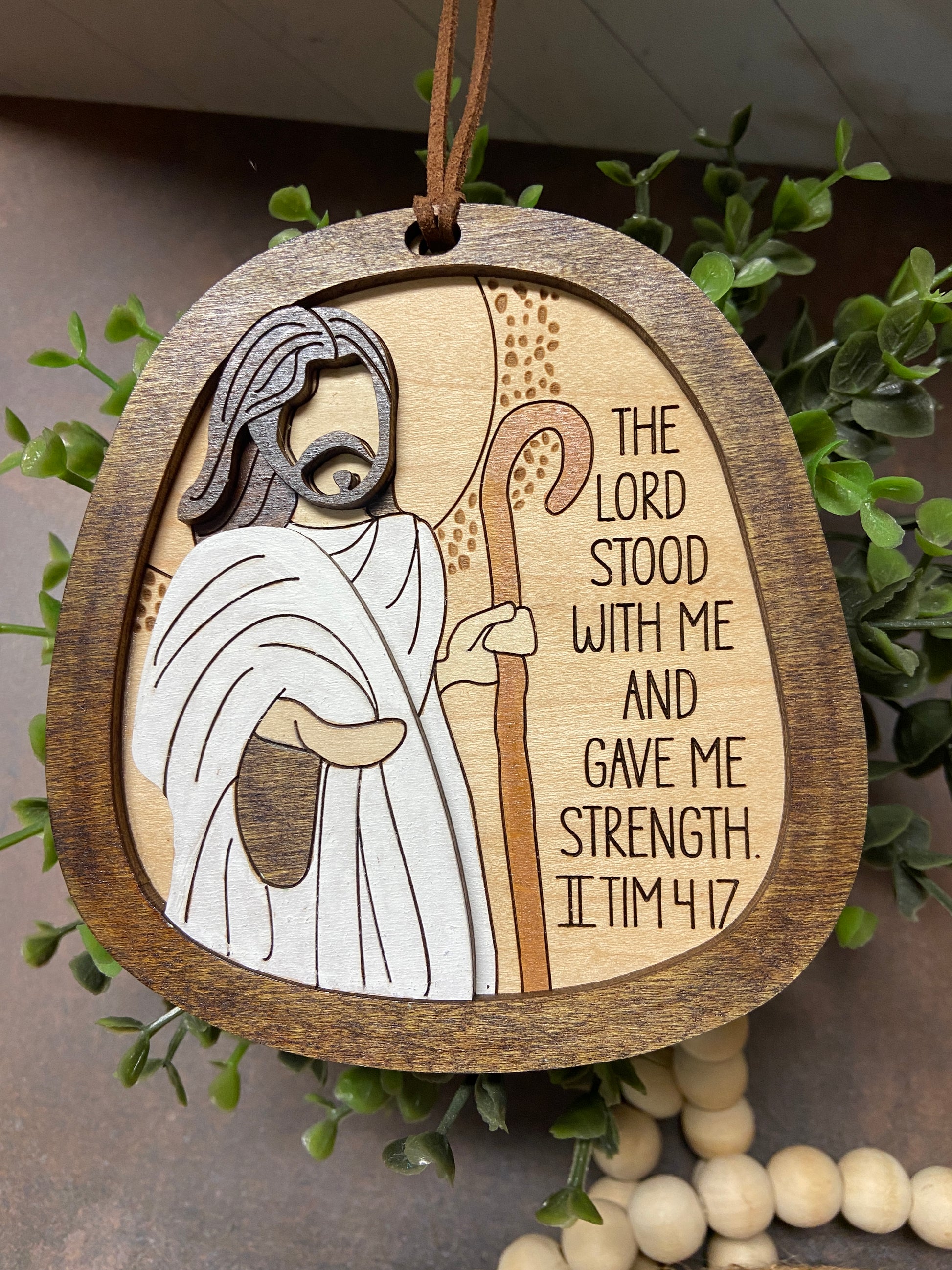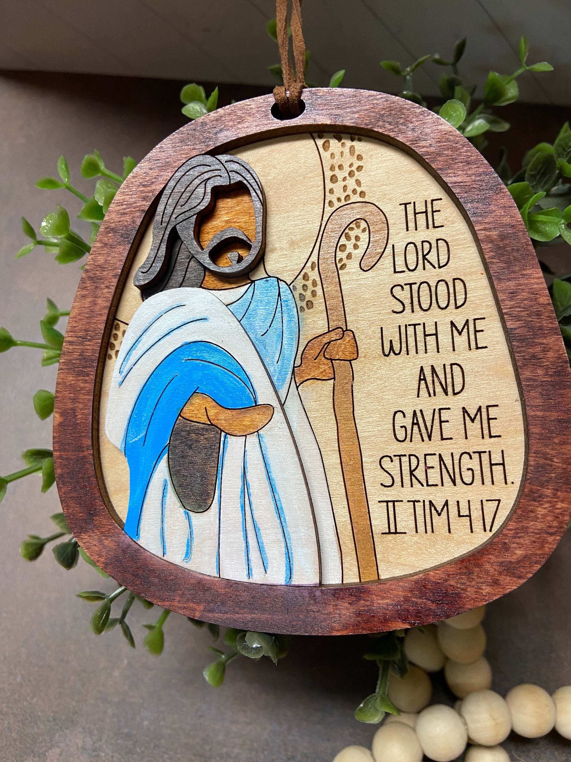 This laser cut, engraved, and hand painted ornament features a two layer design with the inspirational quote "The Lord Stood with me and gave me strength-II Tim 4:17". Measuring 4 x 4.5 inches, it serves as a reminder of strength and faith. Perfect for decorating during the holiday season or year-round. Color will vary