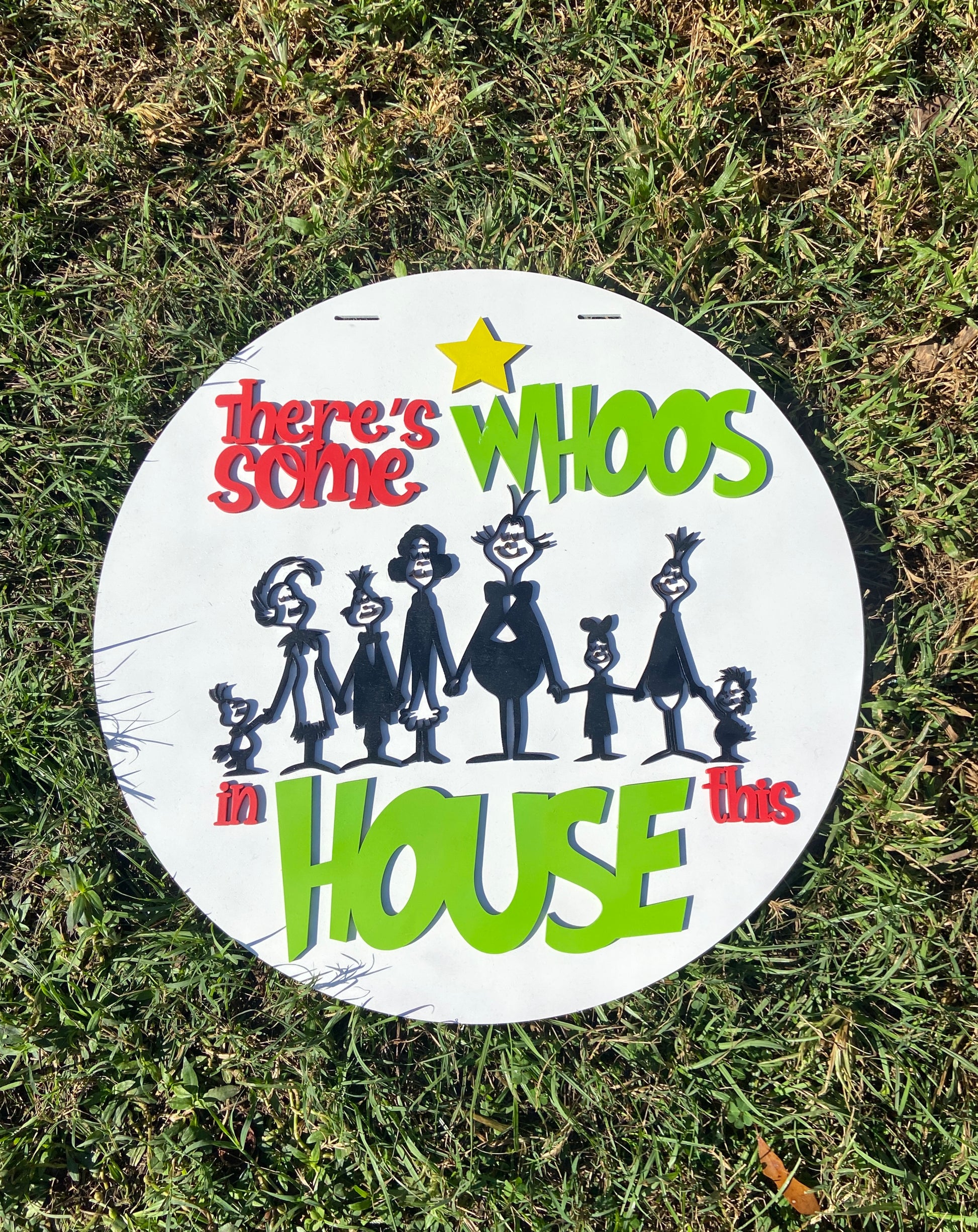 Elevate your home's decor with the whimsical charm of the There is WHOO's in the House Door Hanger. Measuring 18 inches in diameter, this laser cut and hand painted hanger boasts a fun design that is sure to catch the eye. Add a unique touch to your doorway with this charming piece.