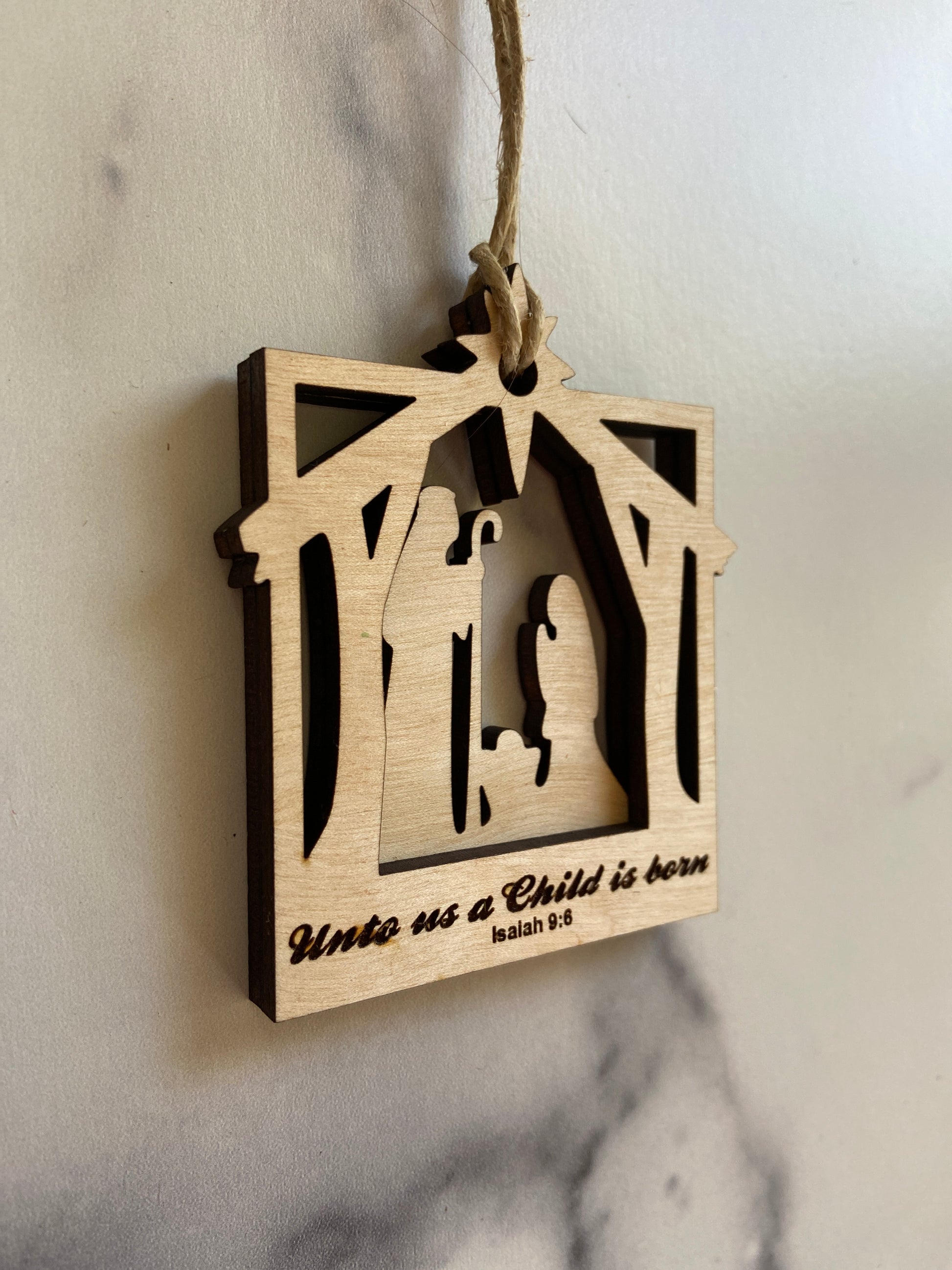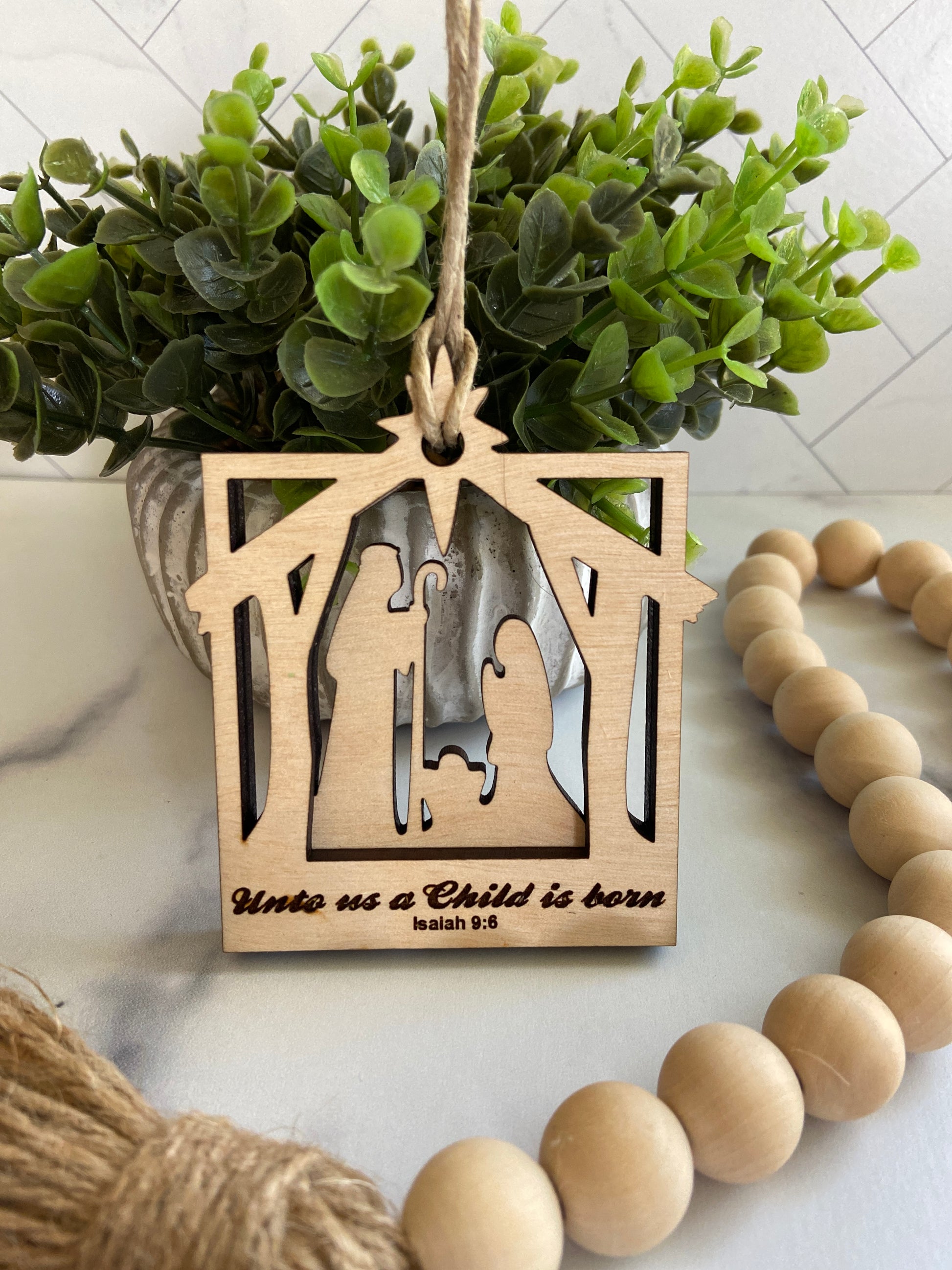 The exquisitely engraved "Unto us a Child is born" verse from Isaiah 9:6 will make an impressive addition to your holiday decor. Crafted with precision using laser technology on Maple wood, this ornament measures 3" X 3.5".