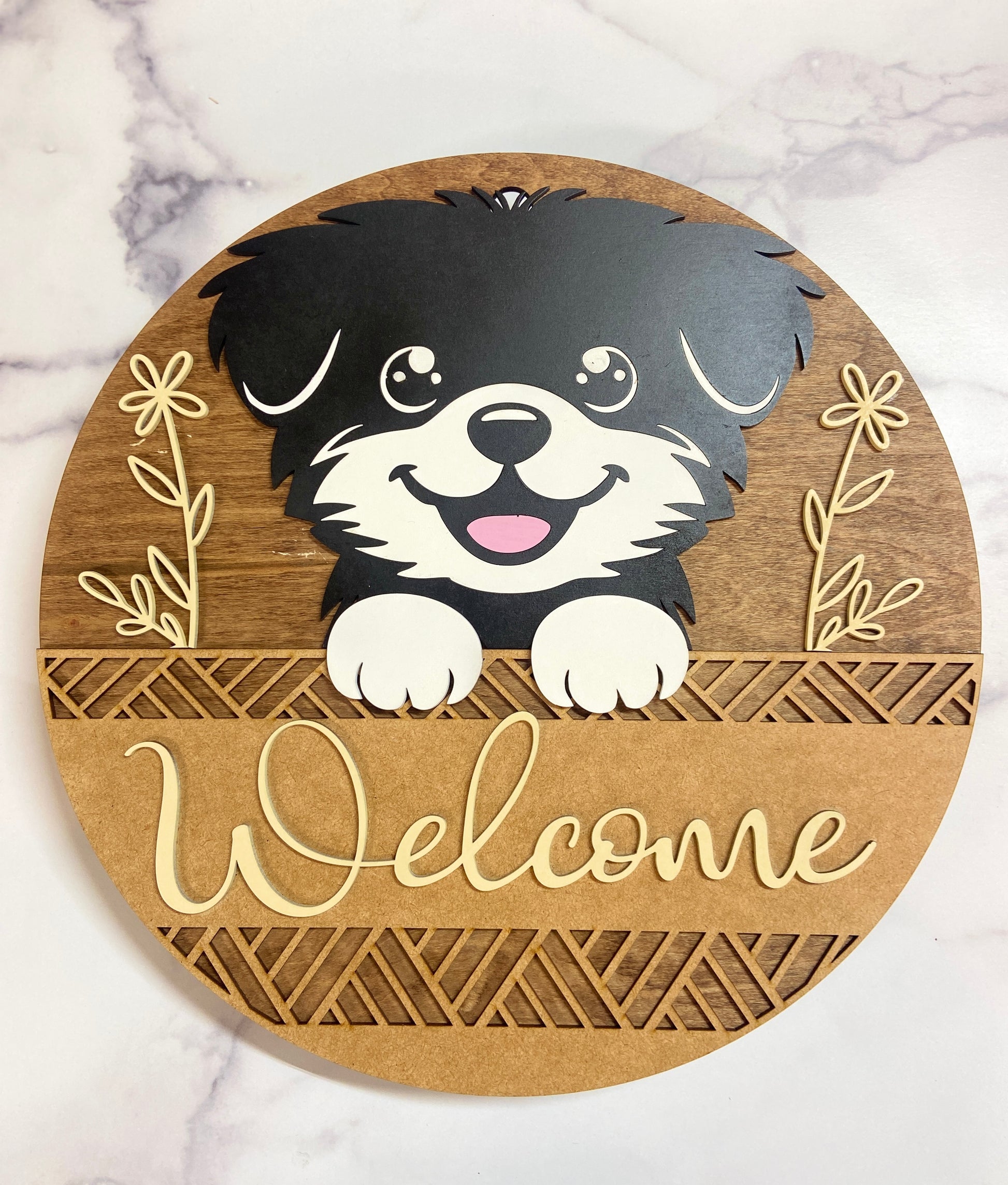 Elevate your home's entrance with our charming Welcome Dog Sign! Handcrafted with precision, this sign boasts a playful design, laser-cut and hand-painted onto two layers of maple wood. Measuring 16 inches, it's the perfect size for any door. Each piece is unique with its own color variation, adding a touch of personality to your home.
