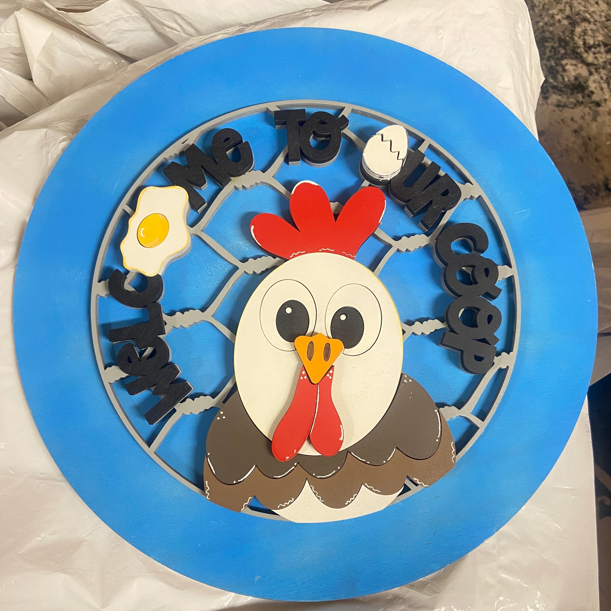 Welcome to our Coop chicken door hanger is sure to get a warm chuckle at your front door. Hang this in the office or your house. This measures 13 inches and colors may vary. Laser cut and hand painted or stained door hanger, order yours today.