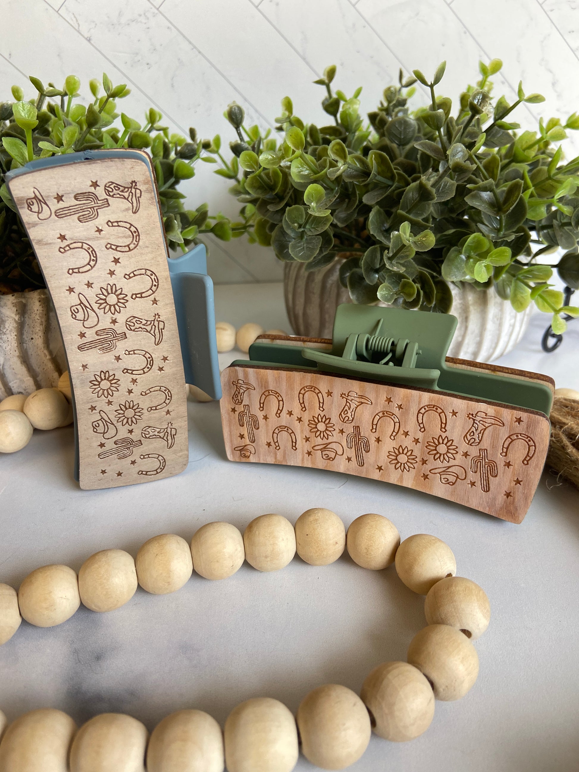 This 2 or 4 inch Western hair clip boasts laser-cut and engraved detailing for a unique and stylish look. Perfect for holding hair in place and adding a touch of Western flair to any outfit. Expertly crafted for durability and a polished finish. Color will vary
